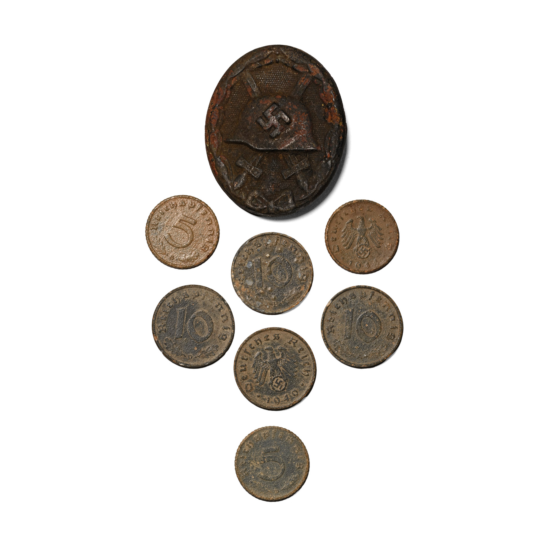 Group of Eight [8] Germany WWII Coins and Military Badge. 1939-1945.
