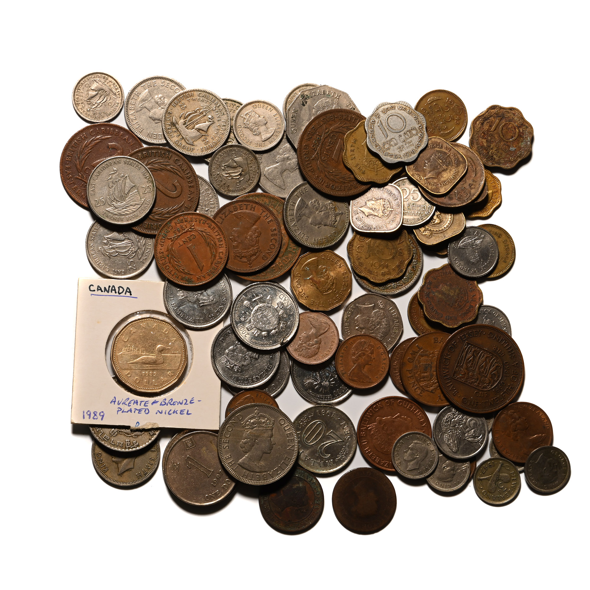 Coins of Canada, Caribbean Territories, Ceylon, Guernsey, Malaysia, & New Zealand. 362gr total.