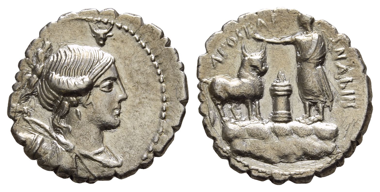 Draped bust of Diana to right; bow and quiver over shoulder, bucranium above / Lighted altar on rock, bull to left, togate figure to right holding aspergillum over bull; A•POST A•F S•N ALBIN (partially ligate) around. Crawford 372/1; BMCRR Rome 2836; RSC Postumia 7. 4.13gr, 19mm, 6h.