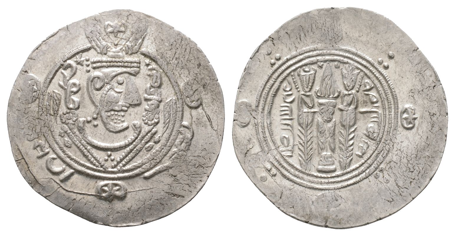 Tabaristan mint. Dated PYE 135 [AH 170 (AD 785/6)]. Stylised crowned Sasanian style bust to right; ‘GDE ʾpzwt (may his glory increase) in Pahlavi to right and left; in outer margin, star-in-crescents, 'pd (excellent) in Pahlavi to lower right, nwk' (good) in Pahlavi to lower left / Fire altar flanked by attendants; pellets flanking flames, date to left, mint to right; alternating triple pellets and star-in-crescents in outer margin. Malek 167.2-4; Album 73A; ICV 120. 1.85gr, 24mm, 4h.