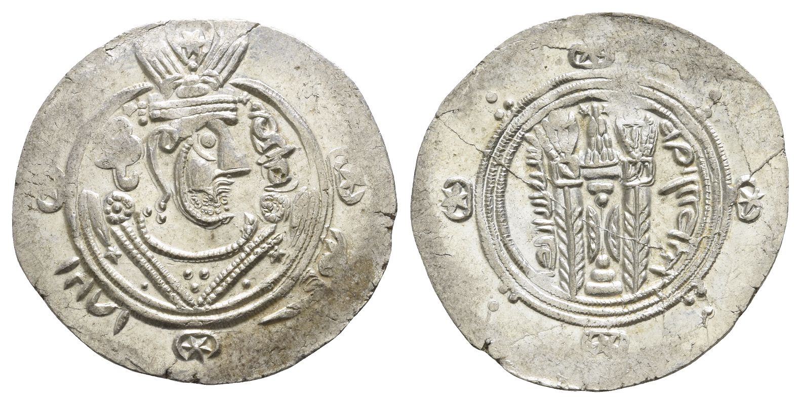 Stylised crowned Sasanian style bust to right; 'GDE ʾpzwt (may his glory increase) in Pahlavi to right and left; in outer margin, star-in-crescents, 'pd (excellent) in Pahlavi to lower right, nwk' (good) in Pahlavi to lower left / Fire altar flanked by attendants; stars flanking flames, date to left, mint to right; alternating triple pellets and star-in-crescents in outer margin. Malek 174.1-8; Album 73; ICV -. 2.10gr, 24mm, 1h.