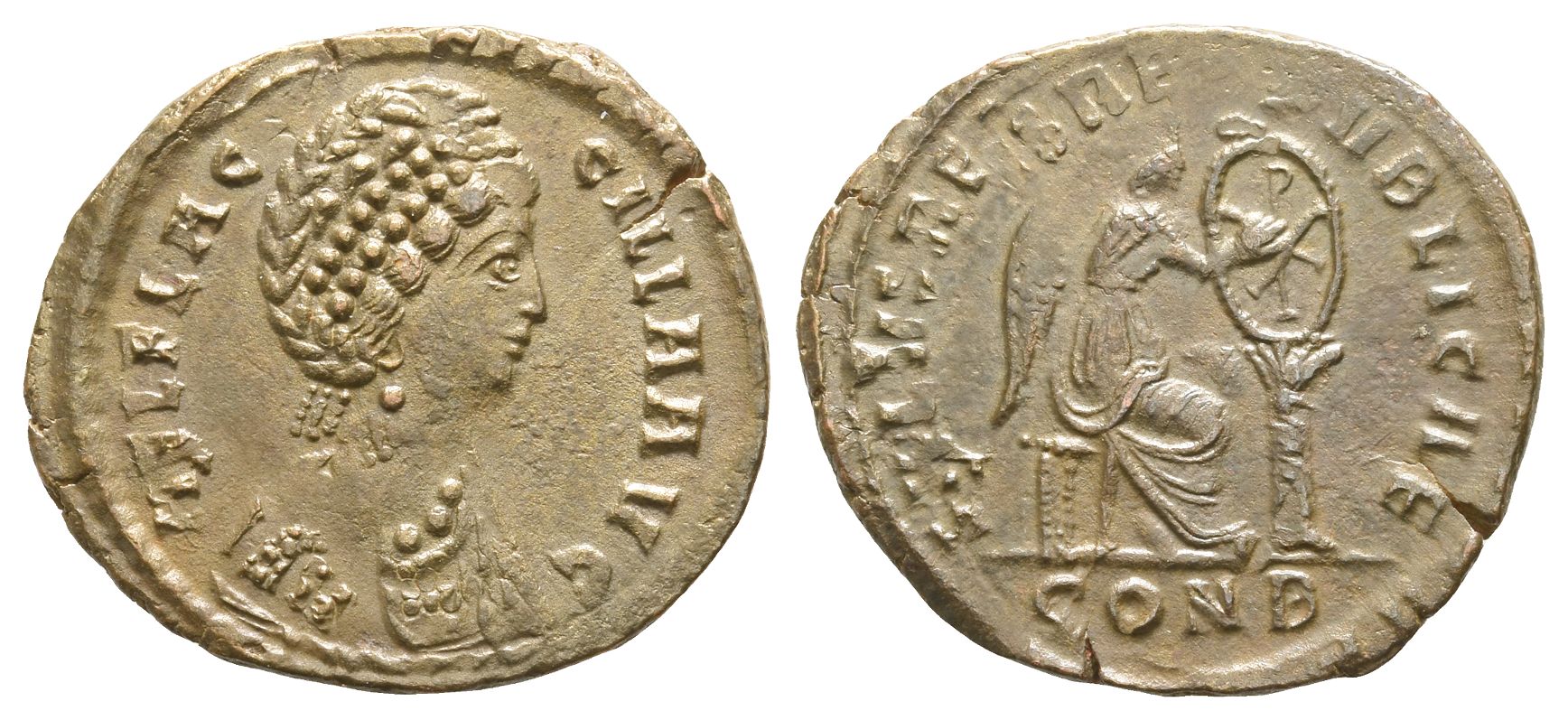 AEL FLACILLA AVG, draped bust to right, wearing elaborate headdress / SALVS REI PVBLICAE, Victory seated to right, inscribing a Chi-Rho on shield set on column, CONB in exergue. RIC IX 81. 4.54gr, 24mm, 6h.