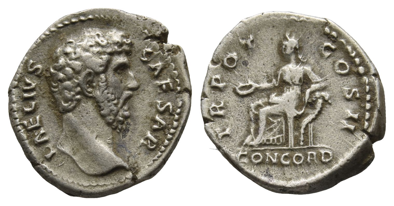 Rome mint. Struck under Hadrian, AD 137. L AELIVS CAESAR, bare head to right / TR POT COS II, Concordia seated to left, holding patera with right hand and resting left elbow on cornucopia; CONCORD in exergue. RIC II.3 2625; BMCRE 981-2 (Hadrian); RSC 1. 2.61gr, 16mm, 7h.