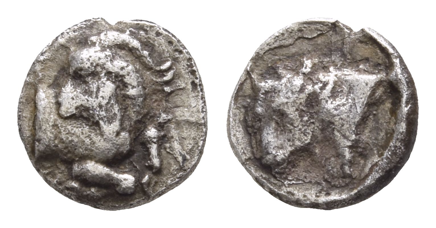 Forepart of goat to right, head reverted; [AIΓAION] around / Head of bull to left. SNG Copenhagen -; BMC -; SNG Ashmolean -; Traité -; SNG BnF -; SNG Levante -; Klein -; Isegrim -; Asia Minor Coins #10220-1. 0.48gr, 8mm, 1h.