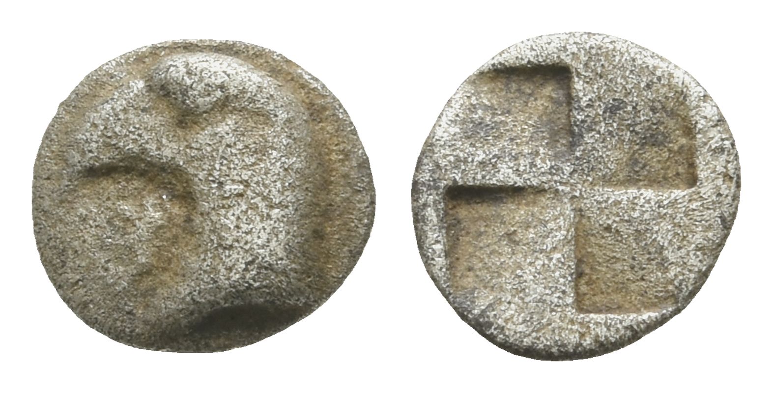 Head of eagle to left, [ethnic] in fields / Quadripartite incuse square. Cf. Klein 333; cf. SNG Arikantürk 1, 170; cf. SNG Copenhagen 32. 0.38gr, 8mm.