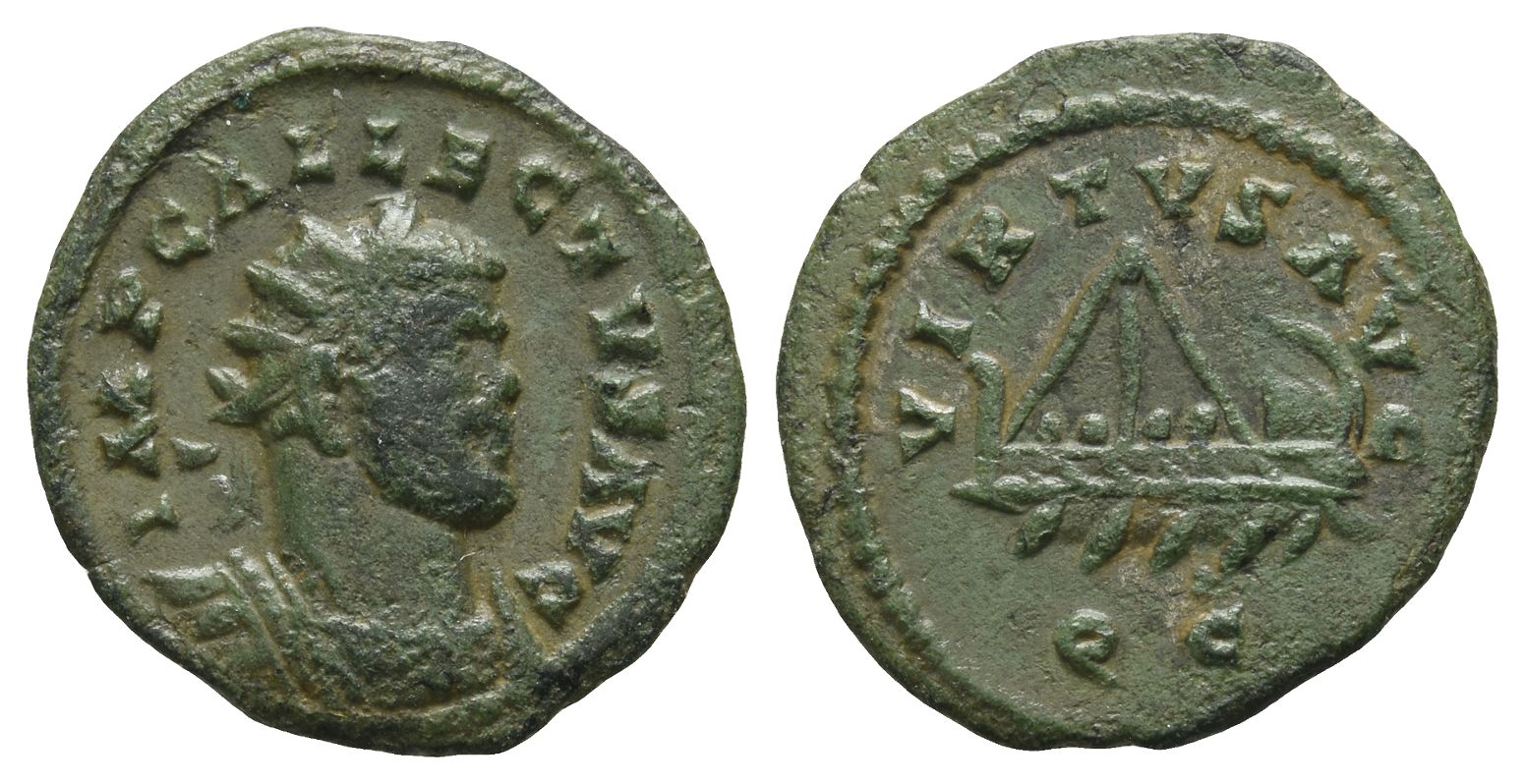 'C' mint; struck AD 295-296. IMP C ALLECTVS P F AVG, radiate and cuirassed bust to right / VIRTVS AVG, galley to left, with four rowers, mast and cabin; Q C below. RIC V 128; Rogiet 1041; Burnett, Coinage 215. 2.24gr, 21mm, 6h.