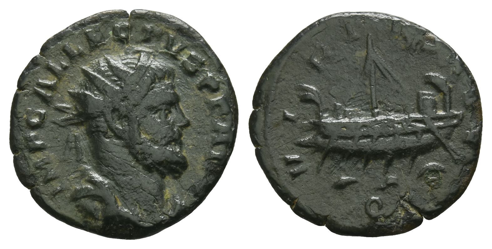 London(?) mint. IMP C ALLECTVS P F AVG, radiate, draped(?) and cuirassed bust to right / VIRTVS AVG, galley to left; waves and Q[...] below. Cf. RIC V.2 55. 2.16gr, 18mm, 7h.