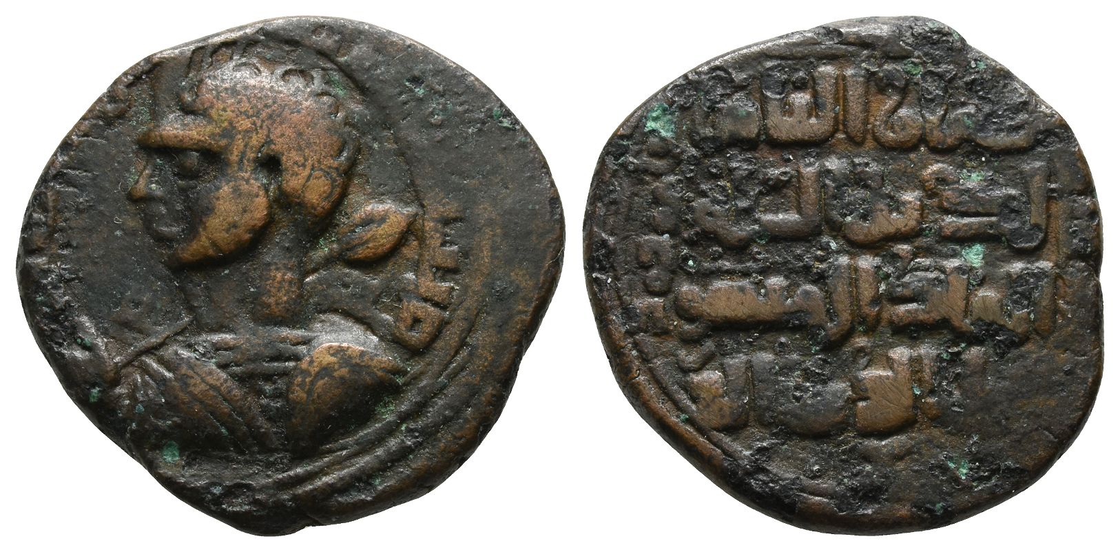Sinjar mint. Dated AH 596 (AD 1199/1200). Bareheaded, draped, and cuirassed male Roman-style bust to left, holding spear or sceptre over shoulder and shield; tamgha before, mint name and AH date around / Names and titles of Abbasid caliph al-Nasir and Qutb al-Din Muhammad bin Zengi in five lines across field; name continued to right and left; Zengid tamgha below. Whelan Type II, 228-9; S&S 81.1; Album 1880.2; ICV 1275. 9.76gr, 26mm, 5h.