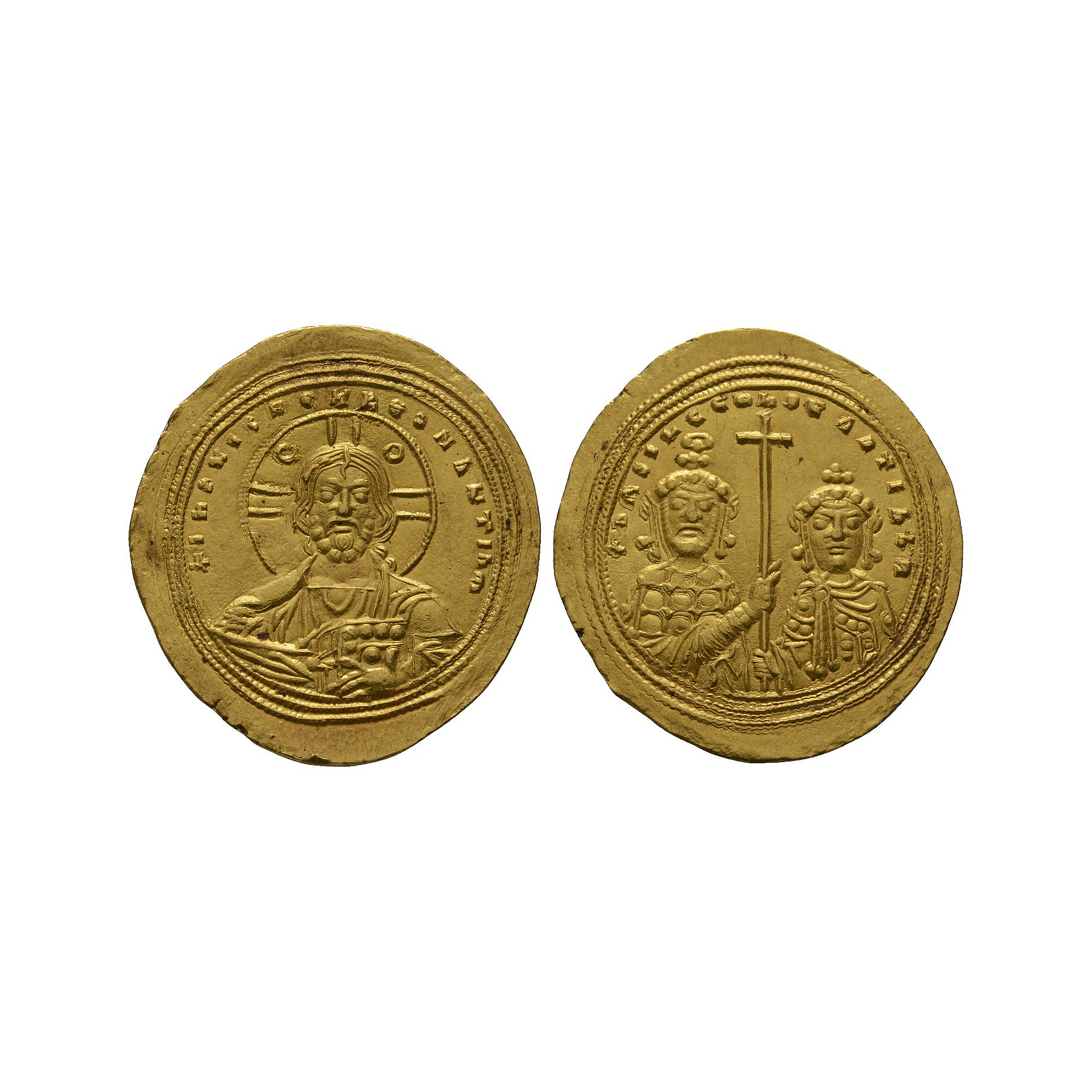 Obv: + IhS XIS REX REGNANTInm, bust of Christ facing, wearing nimbus cross ornamented with two crescents in the limbs of the cross, holding book of Gospels and raising right hand. Rev: + bASIL C COnStAntI b Rm, crowned facing busts of Basil with short beard on left, wearing loros of square pattern, and Constantine VIII, beardless on right, wearing chlamys, holding plain cross between them. 4.43 grams, 27 mm.