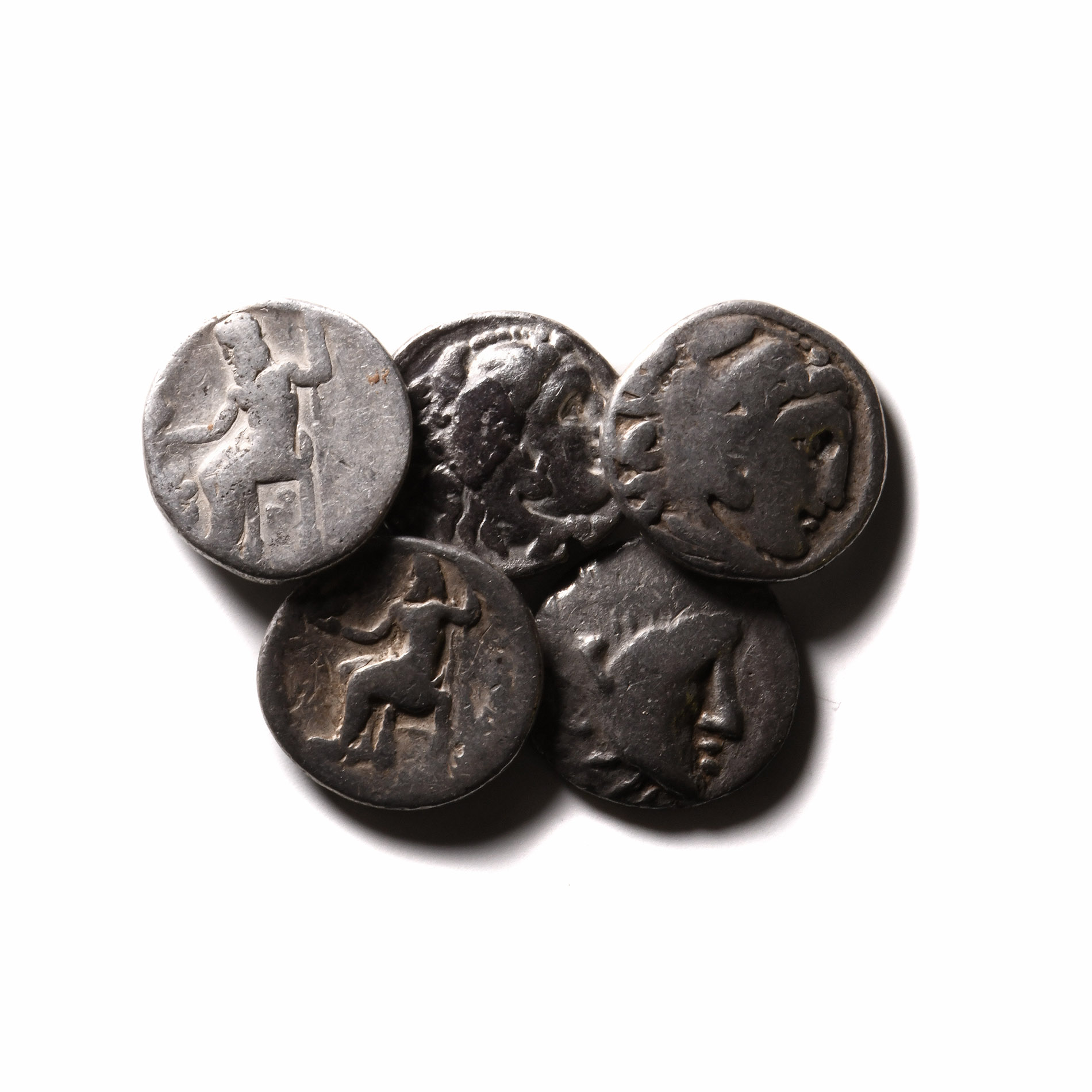 Group comprising drachms of Alexander III. Obvs: profile bust right wearing lion-skin. Revs: Zeus seated left with legend behind; various marks below throne and before. 18.40 grams total.