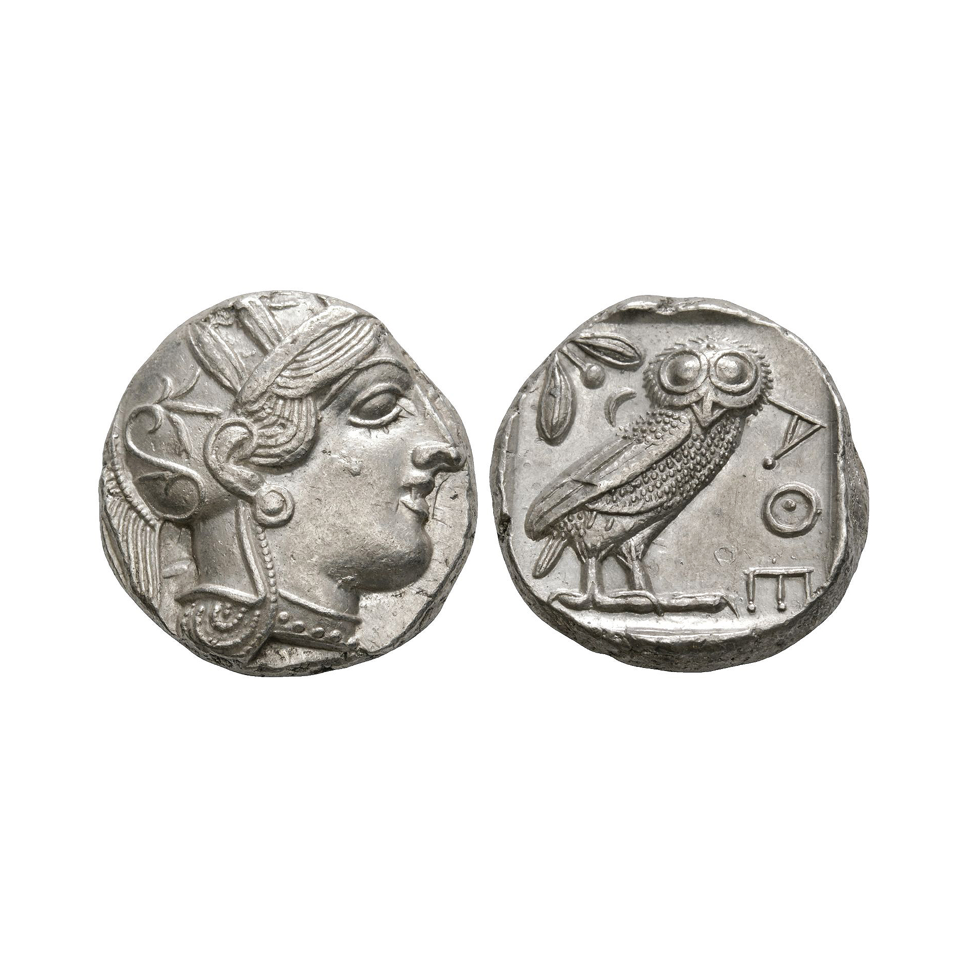 Obv: head of Athena to right, wearing crested Attic helmet decorated with three olive leaves and palmette. Rev: AʘE with owl standing right, head facing; to left, olive sprig and crescent; all within incuse square. 17.17 grams.