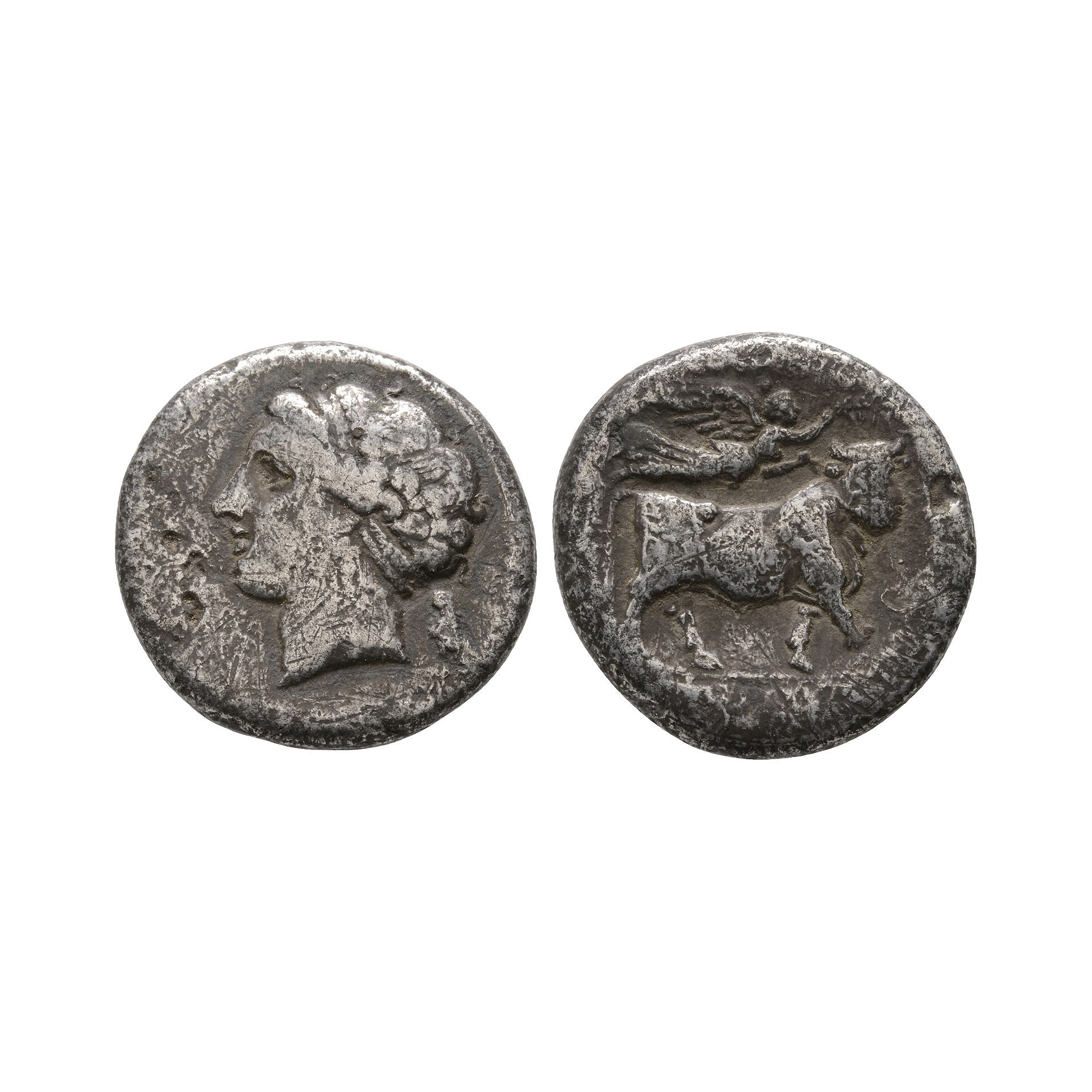 Obv: head of nymph left; cornucopia (?) to right. Rev: man-headed bull walking right; above, crowning Nike flying right; below IΣ//NEΩΠOΛITΩN. 6.76 grams, 20 mm.