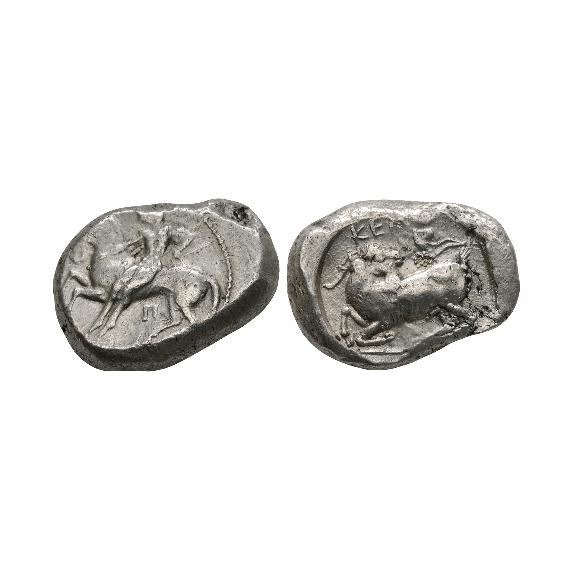 Obv: Ephebus, unbearded, naked, holding whip, sitting sideways on horse galloping left; P below. Rev: KELE above goat recumbent left, head turned right towards a branch of ivy with leaf on one twig and large bunch of berries on the other. 10.67 grams.