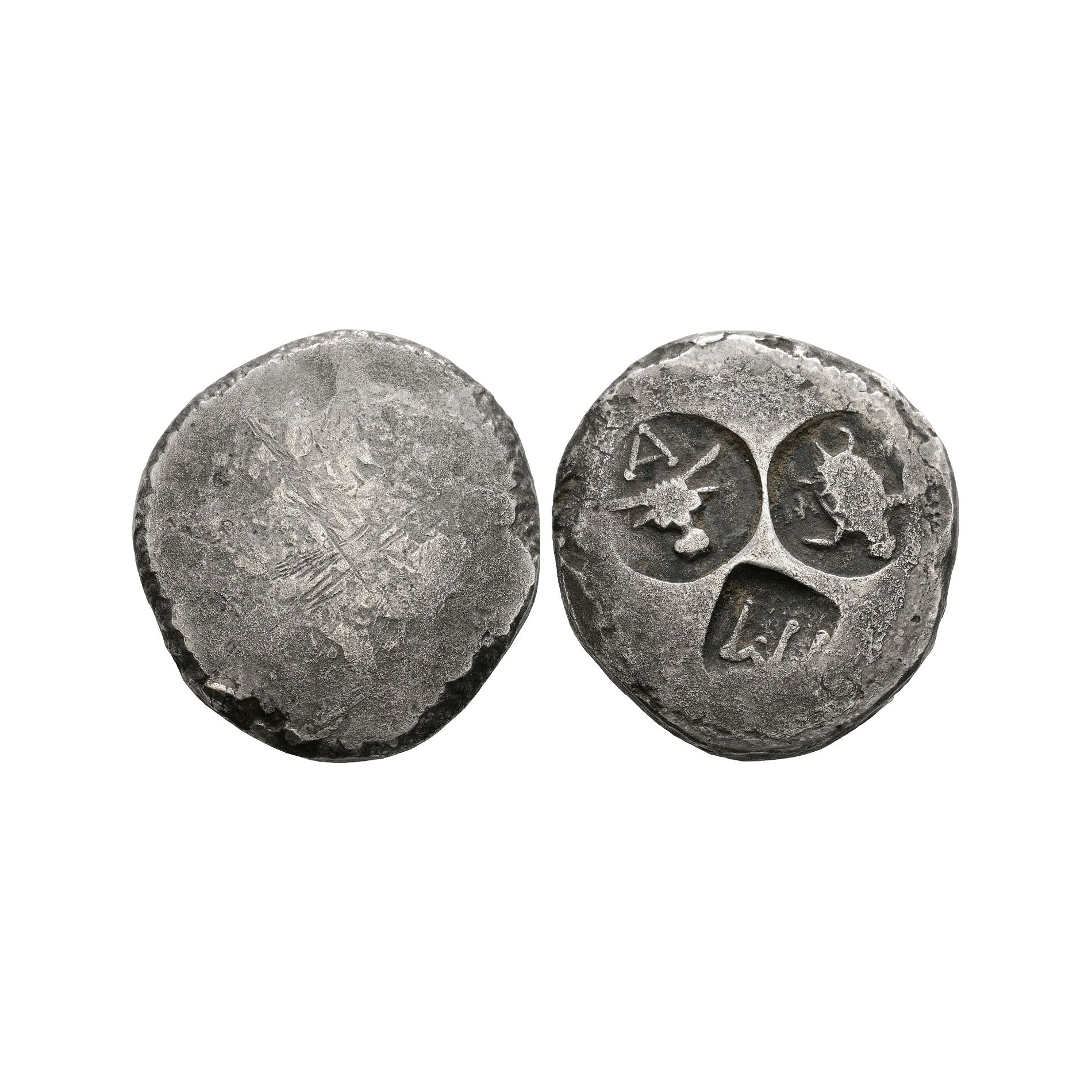 A silver coin ingot with sub-circular body. Obv: traces of head of Dionysos right. Rev: three counterstamps: a turtle, letter A above a bucranium, and IM as individual letters or PM (monogram). 19.5 grams.