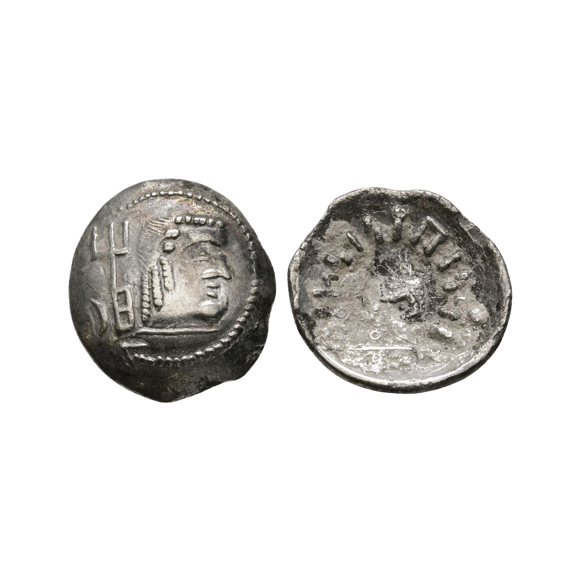 Raidan mint. Obv: bare head right, trident-like tamgha behind head. Rev: "MDNIBYNI RYDN" around small head right, sceptre to right. 1.18 grams.