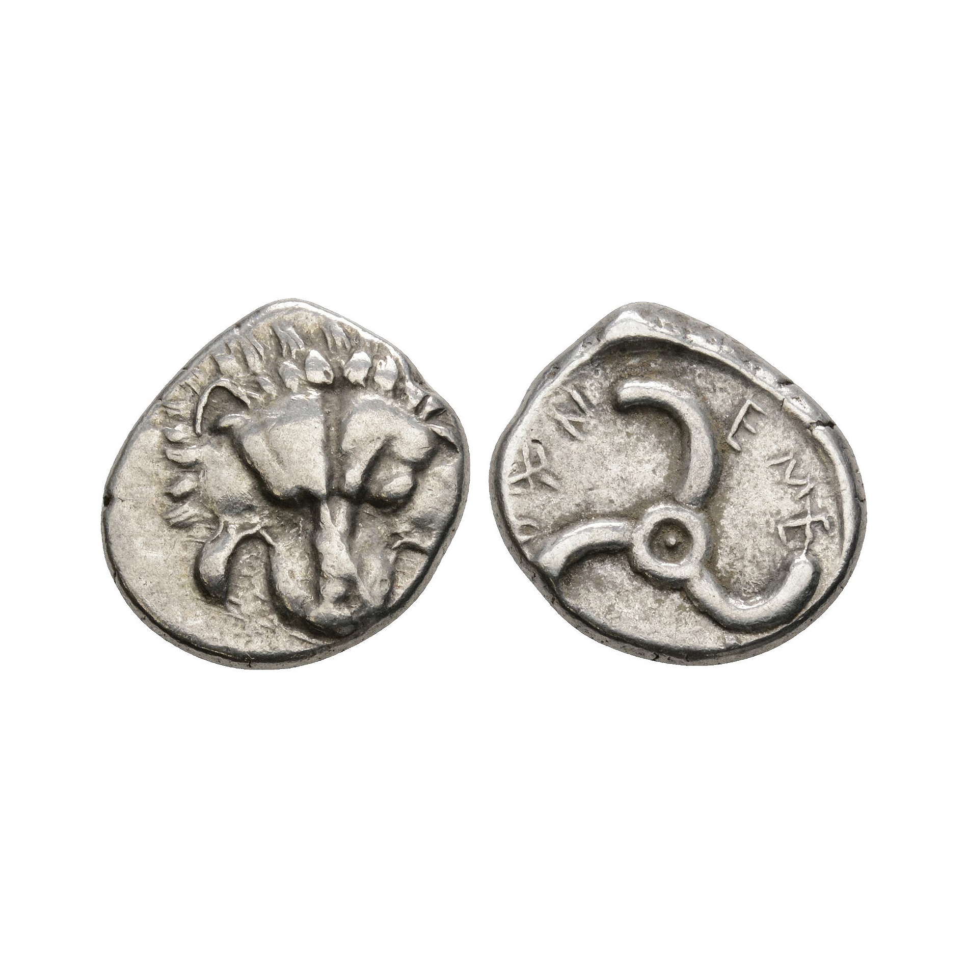 Triobol or tetrobol. Obv: lion's scalp facing. Rev: Lycian legend TRBBWNEME with triskeles rotating left. 2.67 grams.
