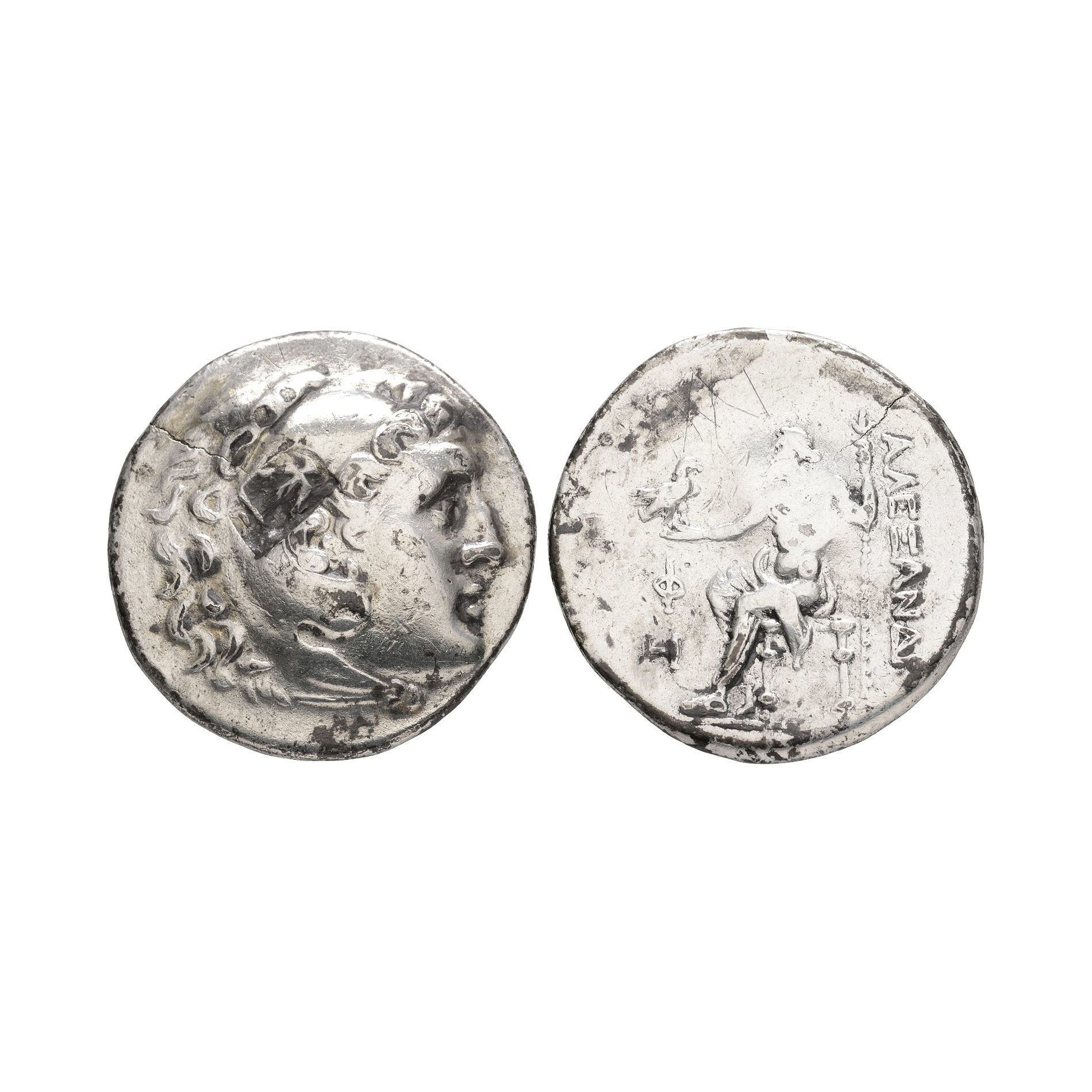Phaselis, Lycia mint, dated year 8, 211-210 BC. Obv: head of Herakles right, wearing lionskin headdress, countermark of Seleukid anchor. Rev: ALEXANDROY legend with Zeus seated left, right leg drawn back, holding eagle and sceptre; F over H in left field. 15.89 grams.