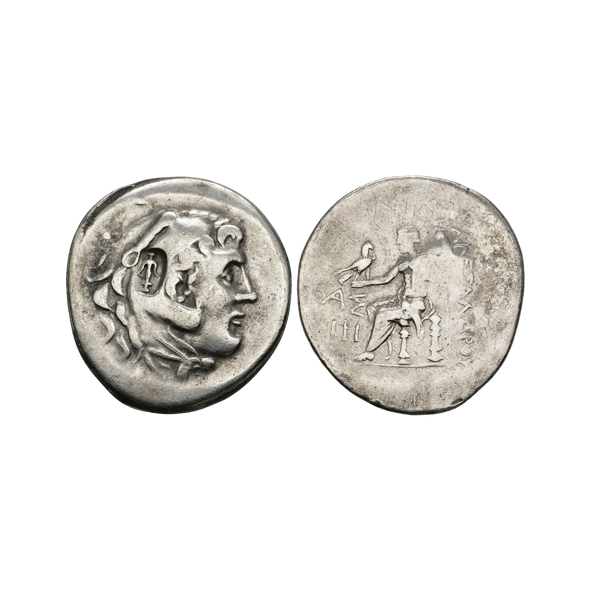 Aspendos, Pamphylia mint, posthumous issue, dated year 18. Obv: head of Herakles right, wearing lionskin headdress; Seleukid anchor countermark on cheek. Rev: ALEXANDROY legend with Zeus seated left, right leg drawn back, holding eagle and sceptre; AS over IH in left field. 15.89 grams.