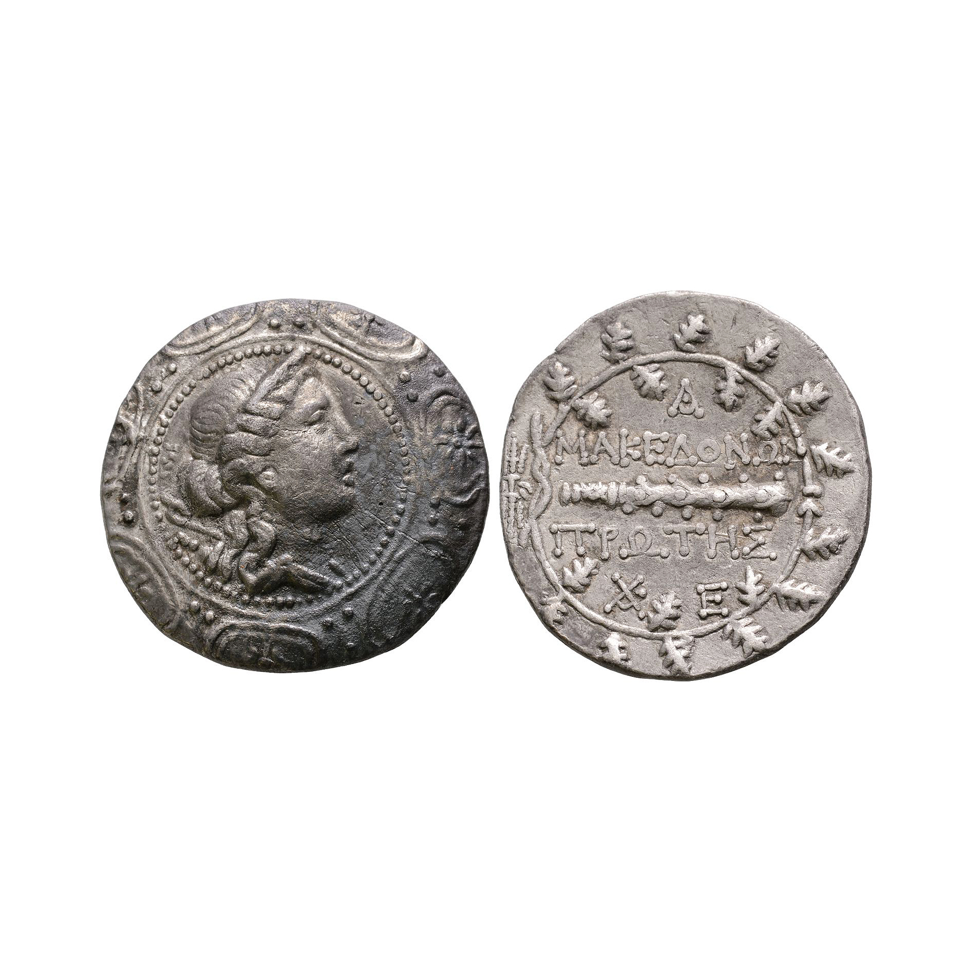 Obv: diademed and draped bust of Artemis right, bow and quiver behind shoulder, all at the centre of a Macedonian shield decorated with three dots between stars in crescents. Rev: MAKEDONWN PRWTHS legend with club to right, dot in A above, XAE monogram in lower left field, E in lower right field, all within oak wreath, thunderbolt in outer left field. 16.60 grams.
