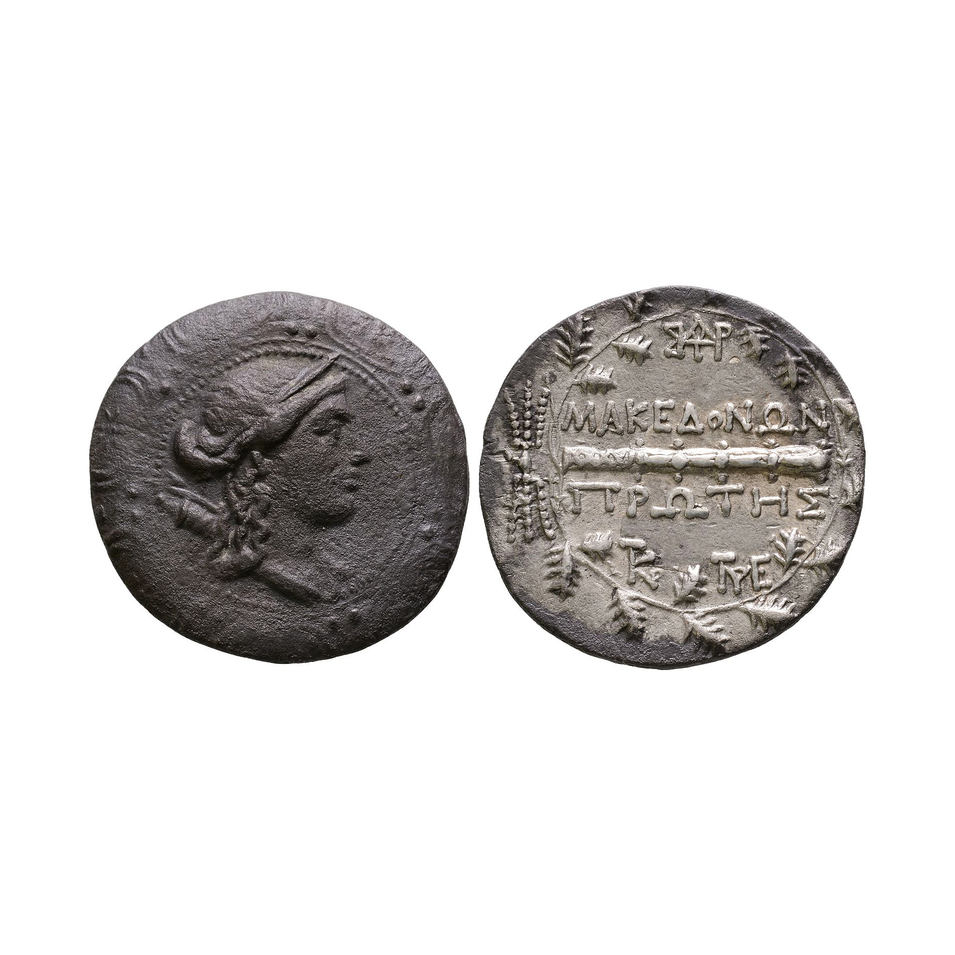 Obv: diademed and draped bust of Artemis right, bow and quiver behind shoulder, all at the centre of a Macedonian shield decorated with three dots between stars in crescents. Rev: MAKEDONWN PRWTHS legend club to right, DYSHR monogram above, TKR monogram in lower left field, TYRE monogram in lower right field, all within oak wreath, thunderbolt in outer left field. 14.66 grams.