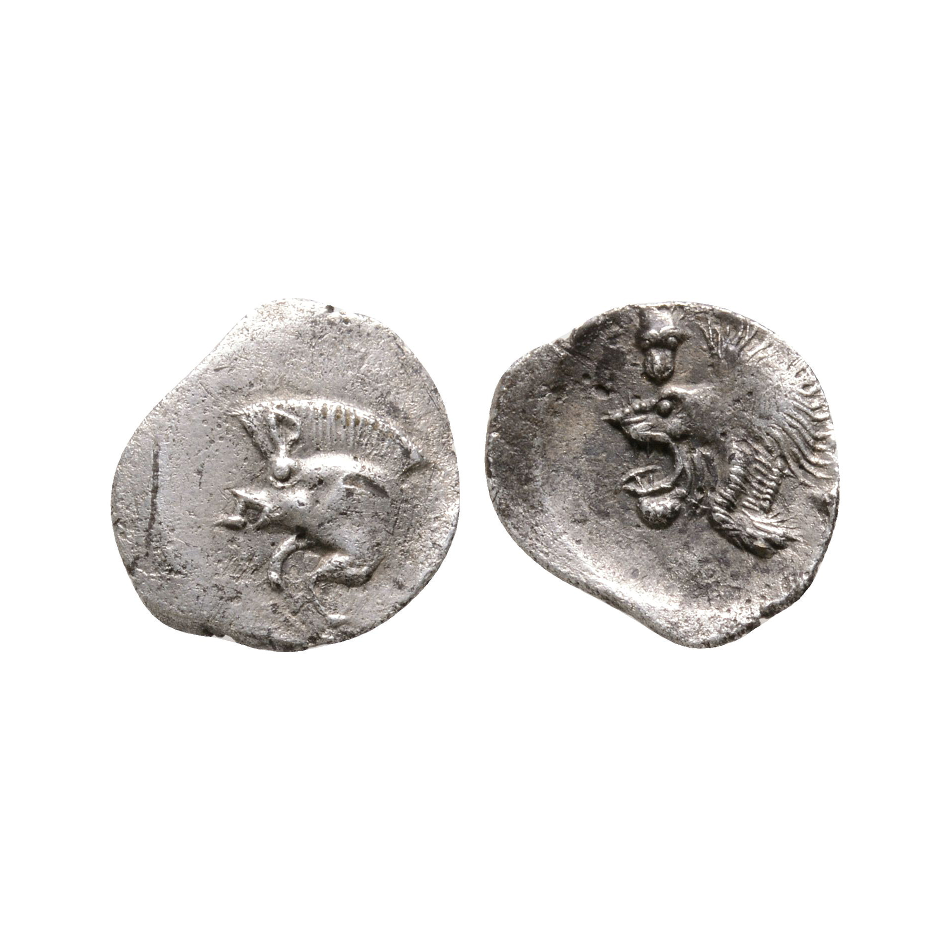 Obv: forepart of boar left, showing both front legs, lower tusks, ears and bristles raised. Rev: head of roaring lion with spiny mane, left; small facing panther head above. 0.36 grams.