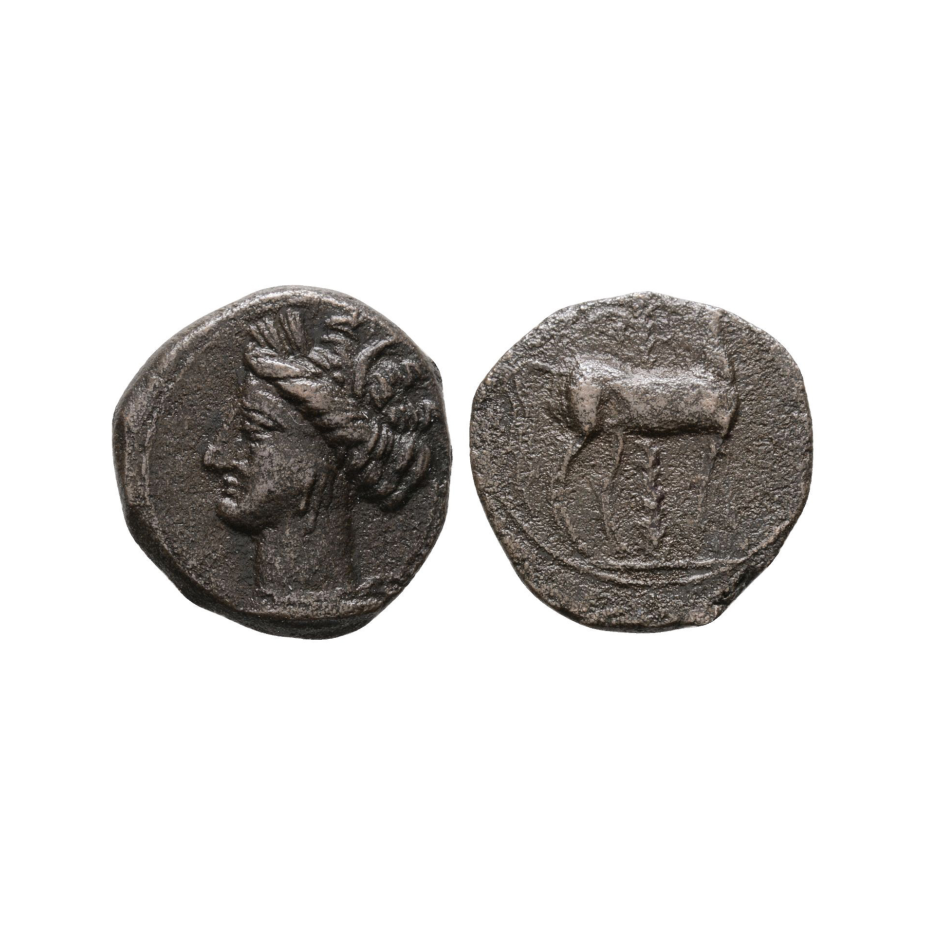 Obv: head of Tanit wreathed with corn and wearing necklace and earrings facing left. Rev: horse standing right with palm tree in the background. 2.19 grams, 16 mm.