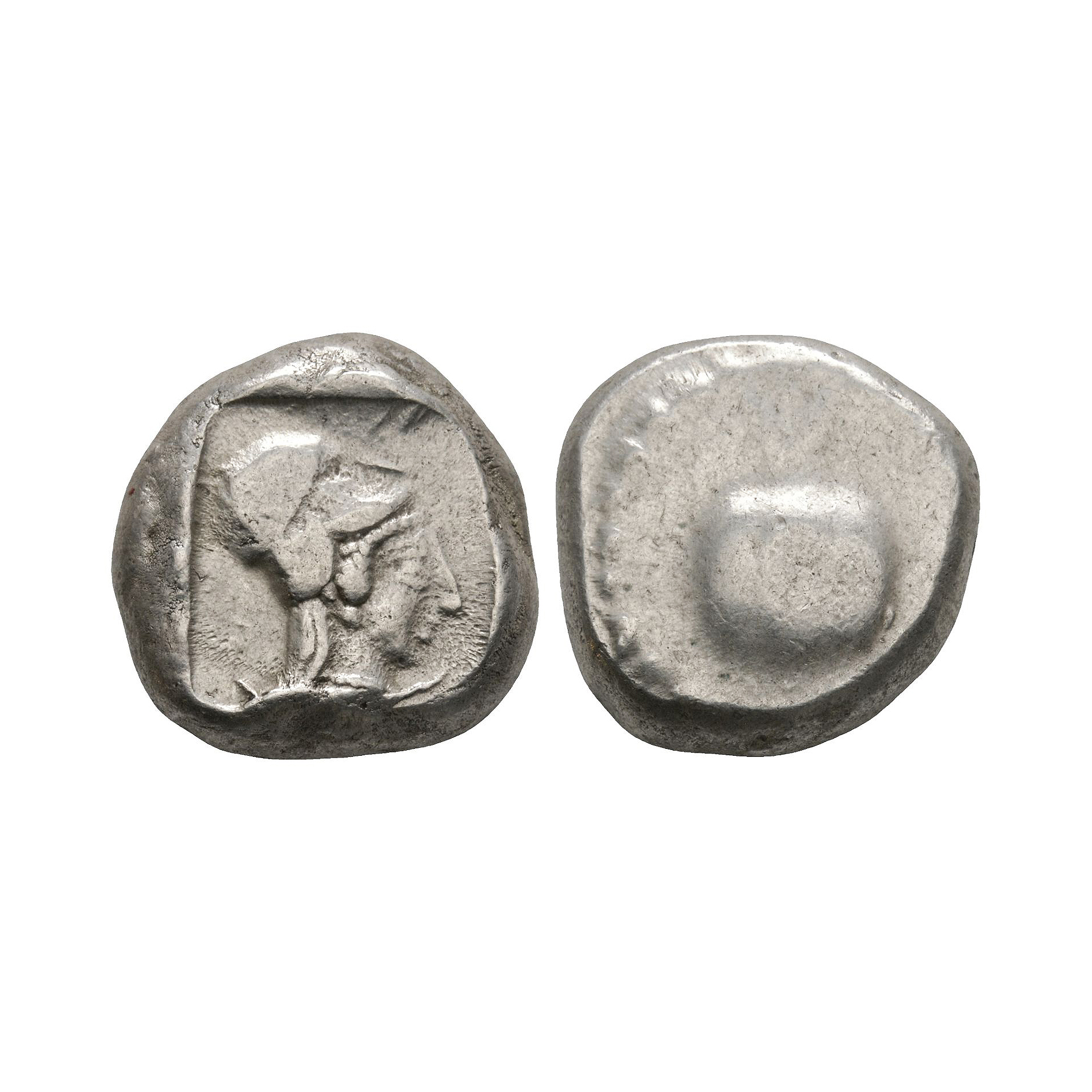 Obv: pomegranate in dotted guilloche border. Rev: archaic, helmetted head of Athena right in incuse square. 10.80 grams.