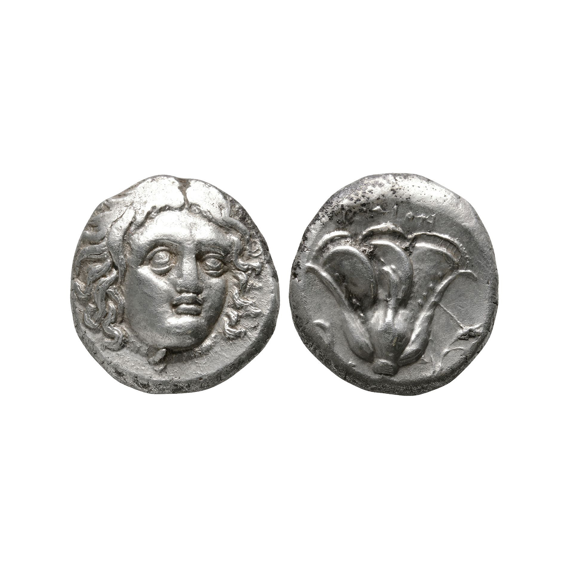 Obv: radiate head of Helios facing slightly right. Rev: rose with two buds flanking. 6.72 grams.