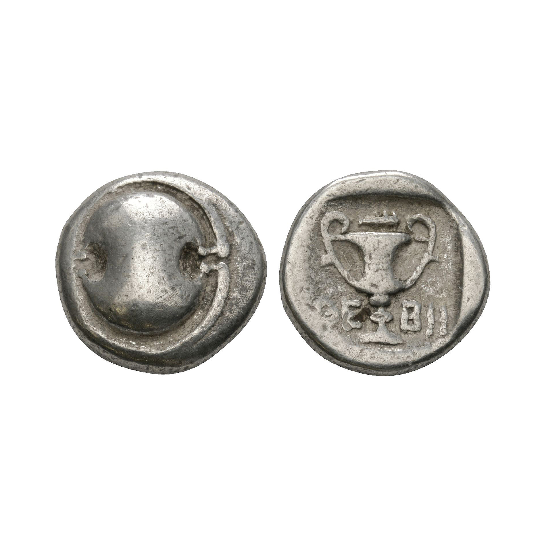 Obv: Boeotian shield. Rev: kantharos with OE - BH across fields; club above, within incuse square. 2.50 grams.