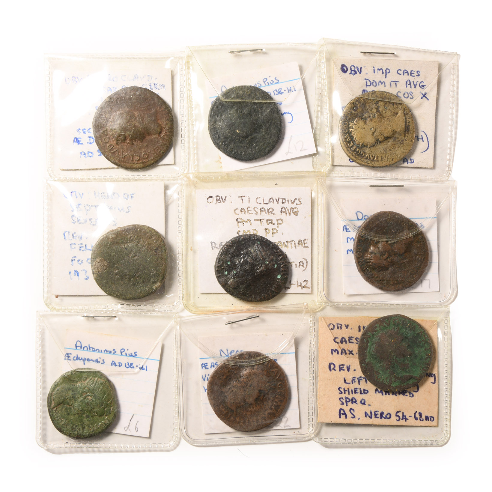 Comprising: various monarchs, denominations, issues and types, mostly with handwritten coin identification tickets. 121 grams total, 50 x 50 mm including case each.