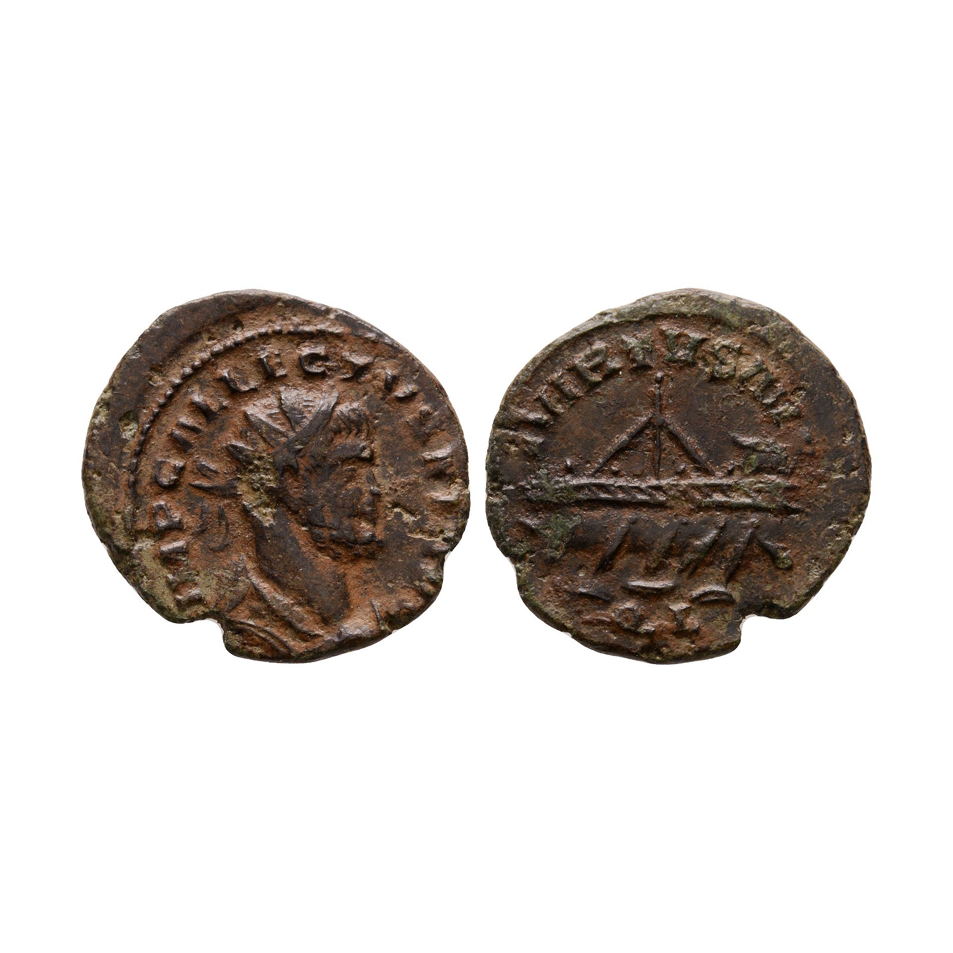 Londinium mint. Obv: IMP C ALLECTVS PF AVG, radiate, cuirassed bust right. Rev: VIRTVS AVG, galley rowing left, mintmark QL in exergue. 2.52 grams, 19.66 mm.