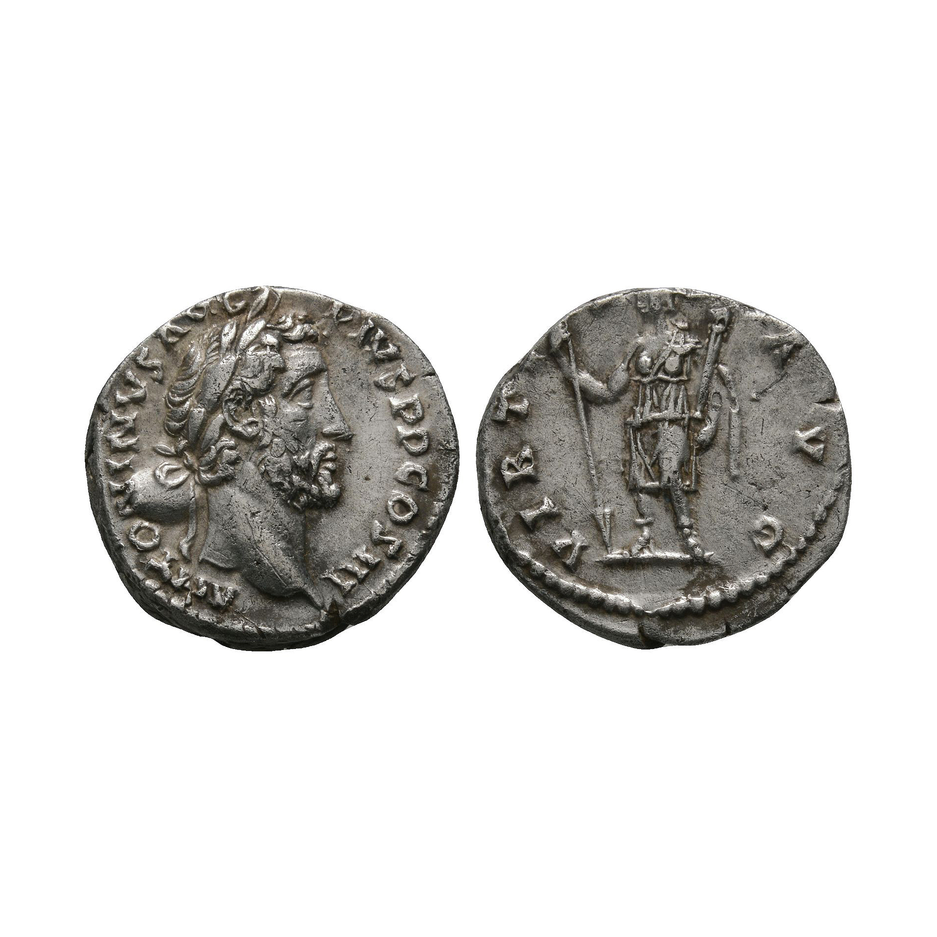 Ancient Roman Imperial Coins - Antoninus Pius - AR Virtus Denarius 140-143 A.D.