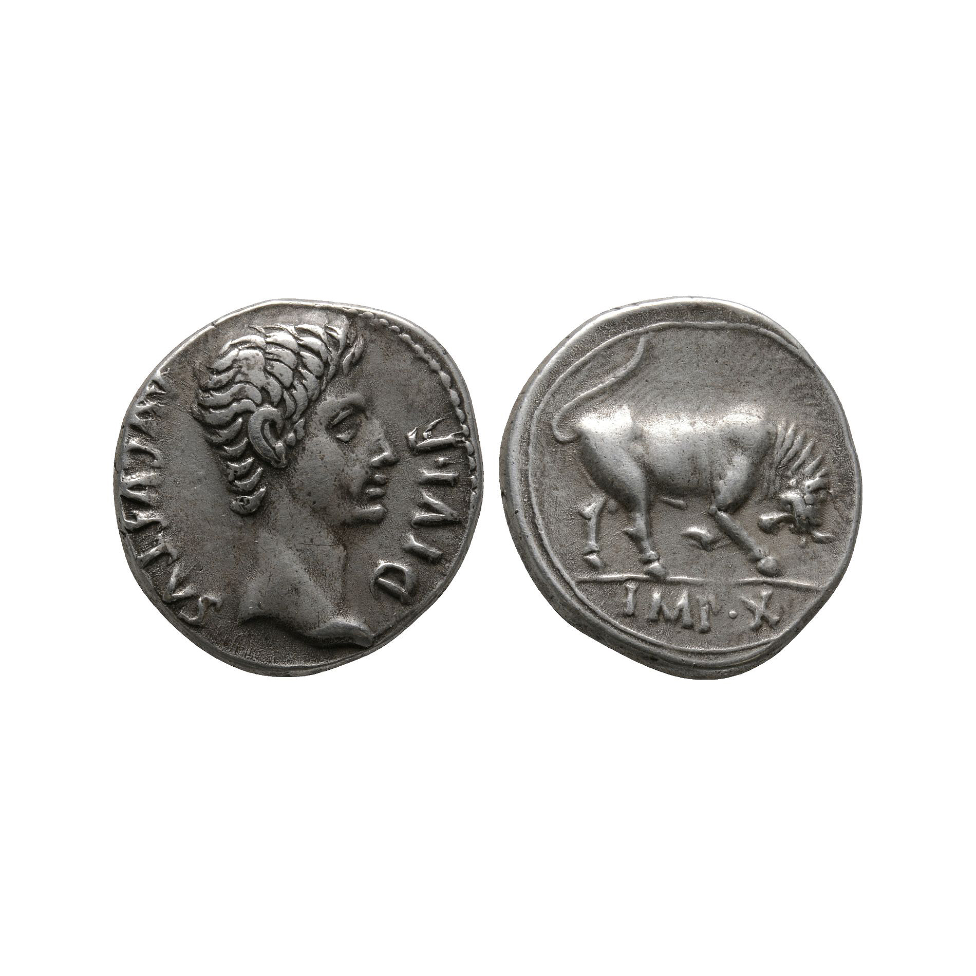 Lyons mint. Obv: AVGVSTUS DIVI F legend with bare head right. Rev: IMP X legend beneath bull butting right. 3.83 grams.