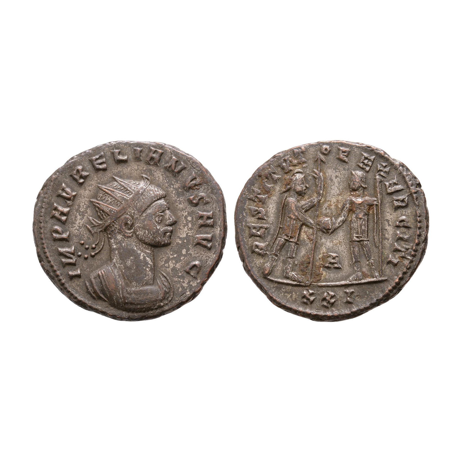 Cyzicus mint. Obv: IMP AVRELIANVS AVG legend with radiate and cvuirassed bust right. Rev: RESTITVTOR EXERCITI legend with Mars standing right holding spear, presenting globe to emperor, standing left holding sceptre left hand; Δ in centre field, mintmark XXI in exergue. 4.03 grams.