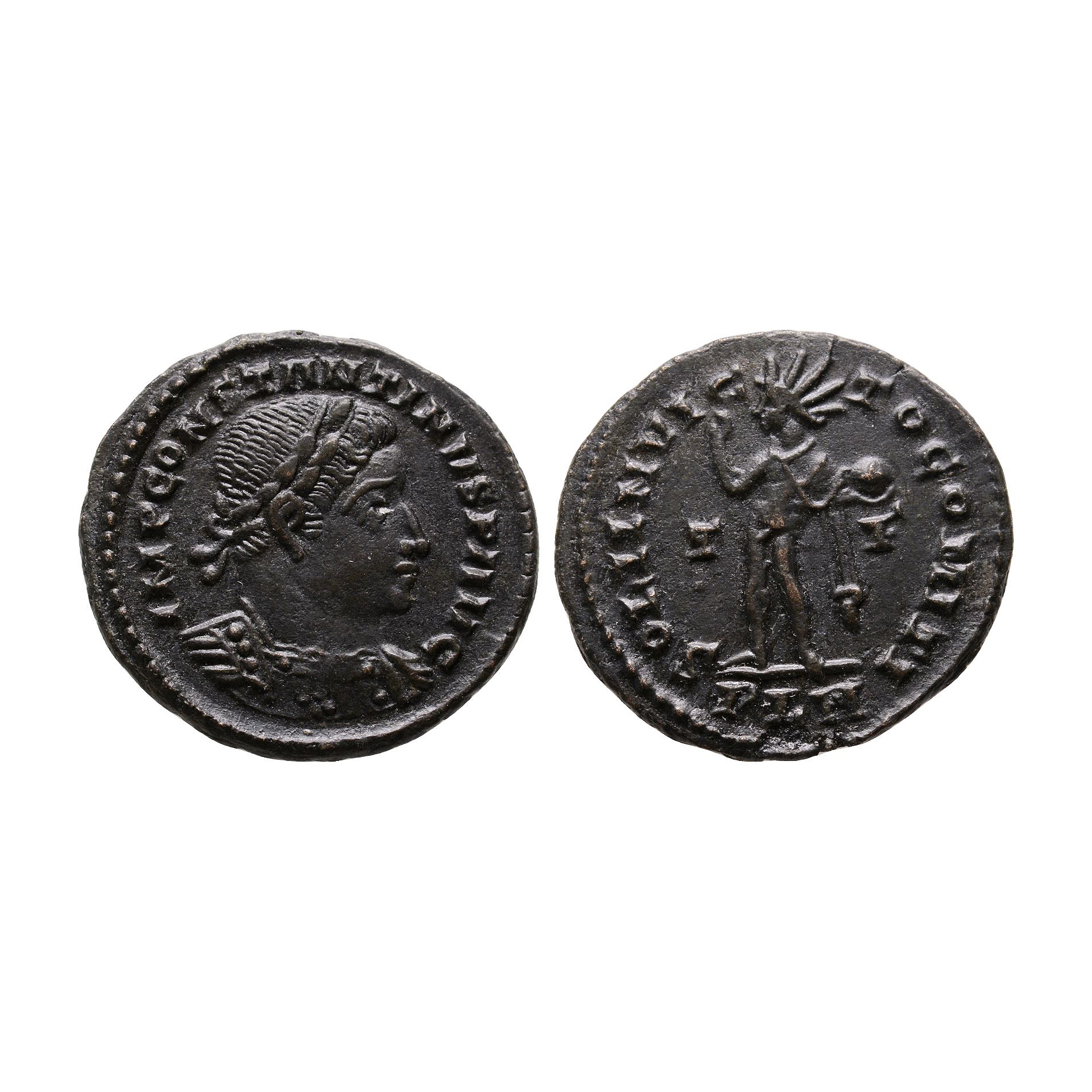 Obv: IMP CONSTANTINVS P AVG, laureate and cuirassed bust right. Rev: SOLI INVICTO COMITI T-F, Sol standing left, chlamys falling from left shoulder, holding globe and raising right hand, mintmark PLN. 4.42 grams, 23 mm.