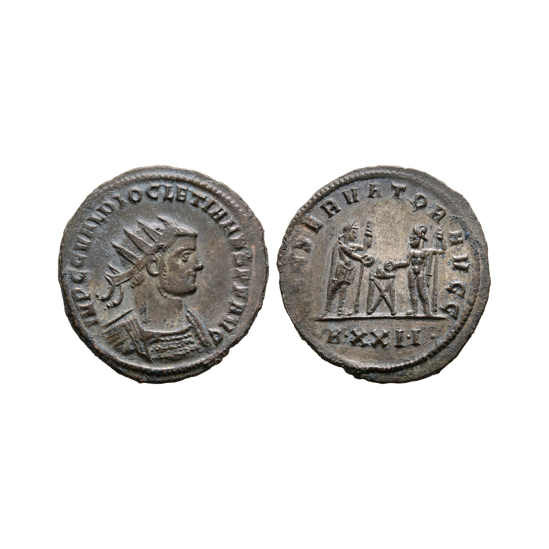 Siscia mint. Obv: IMP C C VAL DIOCLETIANVS P F AVG legend with radiate and cuirassed bust right. Rev: CONSERVATOR AVGG legend with emperor standing right facing Jupiter standing left holding sceptres and sacrificing over altar between; B XXI I in exergue. 3.32 grams.