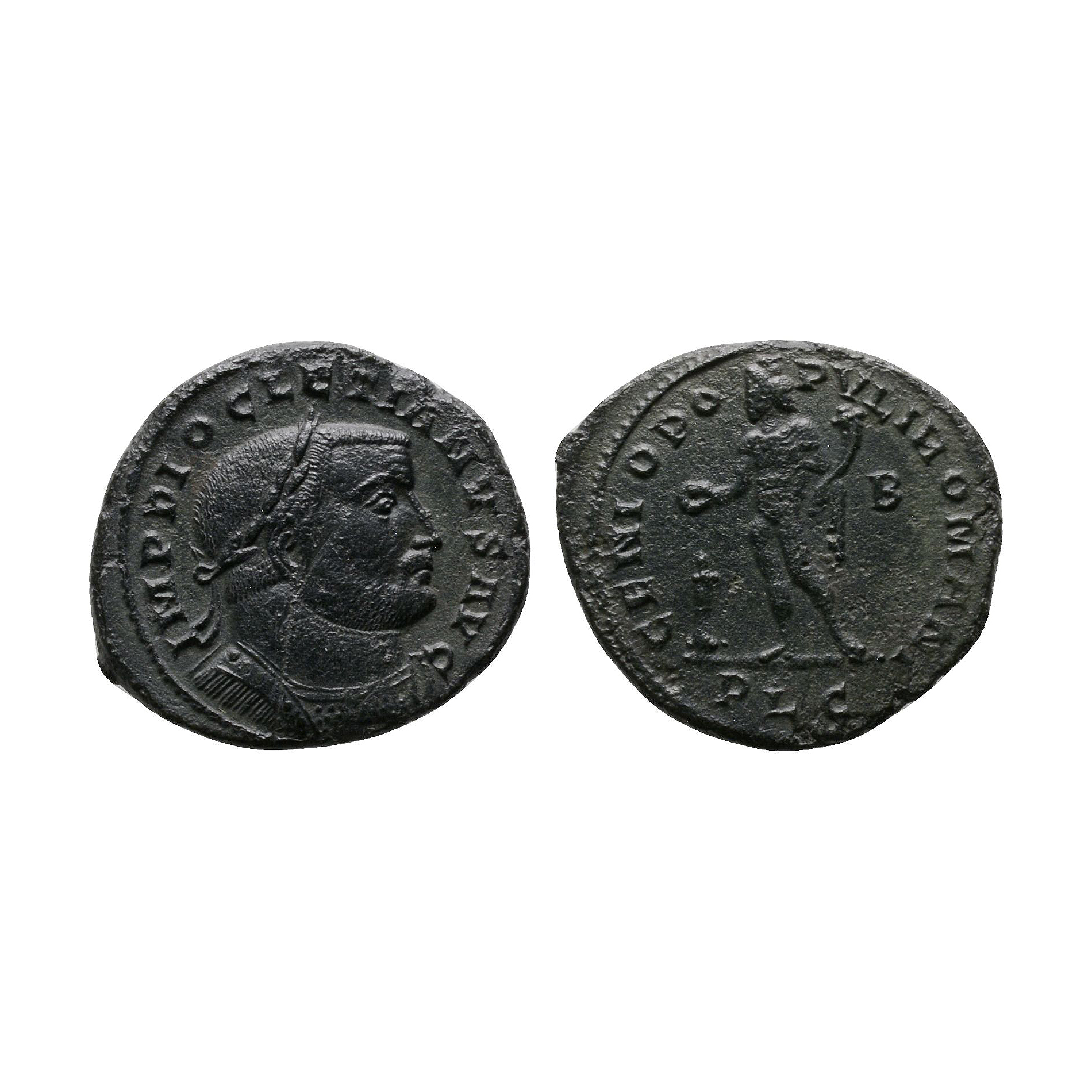 Lyons mint. Obv: IMP DIOCLETIANVS PF AVG, laureate, cuirassed bust right. Rev: GENIO POP-VLI ROMANI, Genius standing left by altar, modius on head, naked but for chlamys over left shoulder, holding patera and cornucopia, B in right field, mintmark PLG. 8.28 grams.