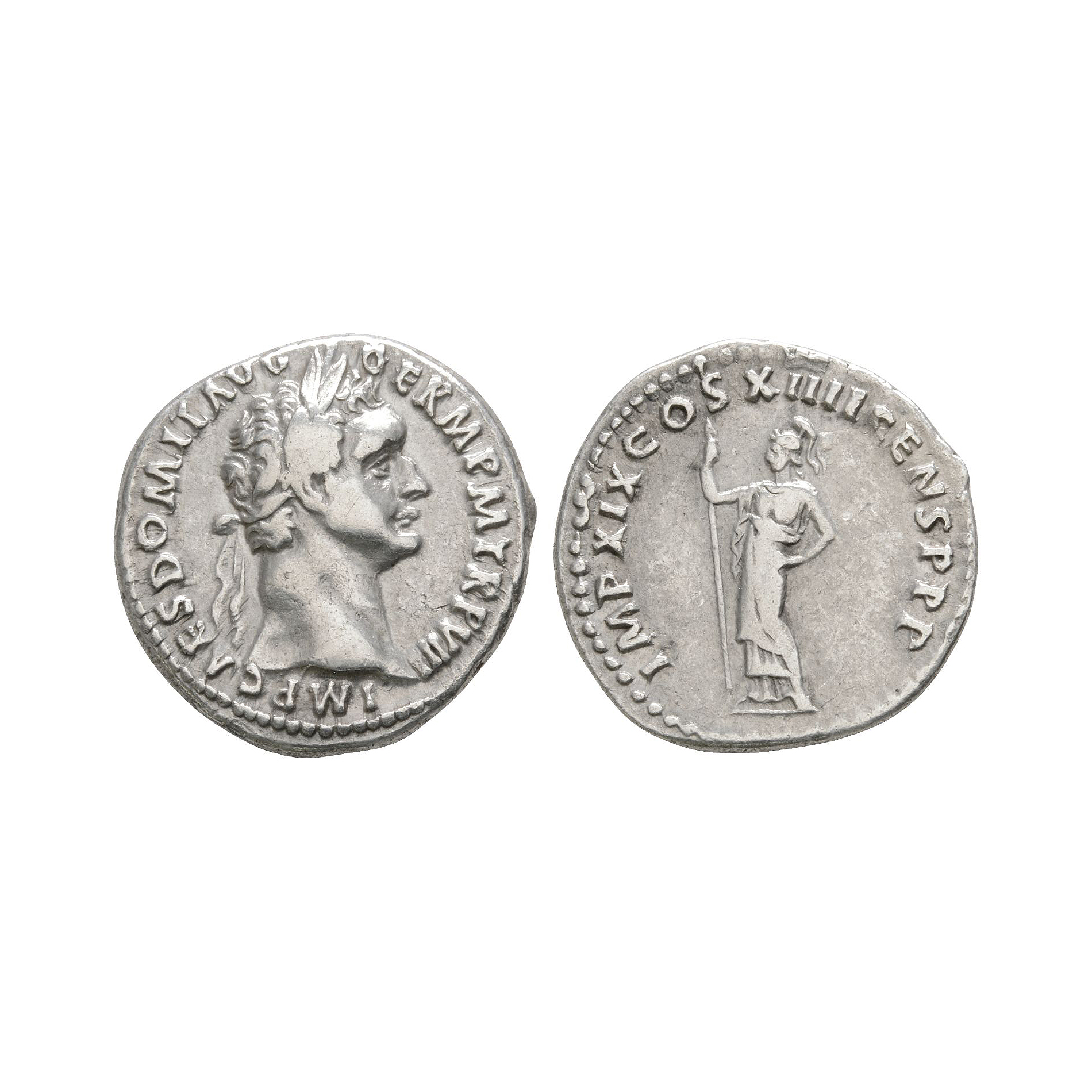 Rome mint. Obv: IMP CAES DOMIT AVG GERM PM TRP VIII legend with laureate head right. Rev: IMP XIX COS XIIII CEN SPPP legend with Minerva standing left, holding spear. 3.51 grams.