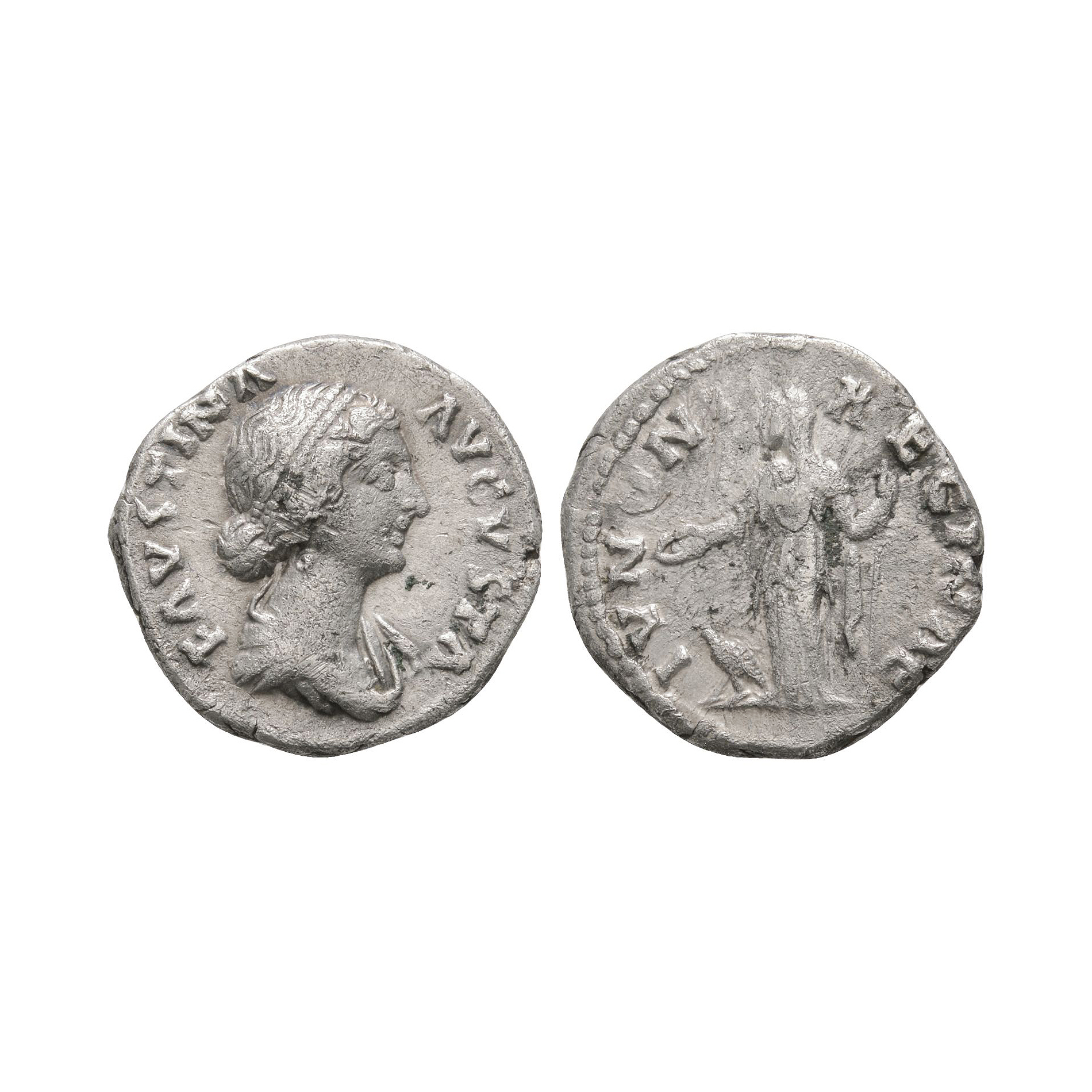 Obv: FAVSTINA AVGVSTA, draped bust right, wearing diadem. Rev: IVNONI REGINAE, Juno standing left, holding patera and sceptre, peacock at foot left. 3.24 grams, 17.33 mm.