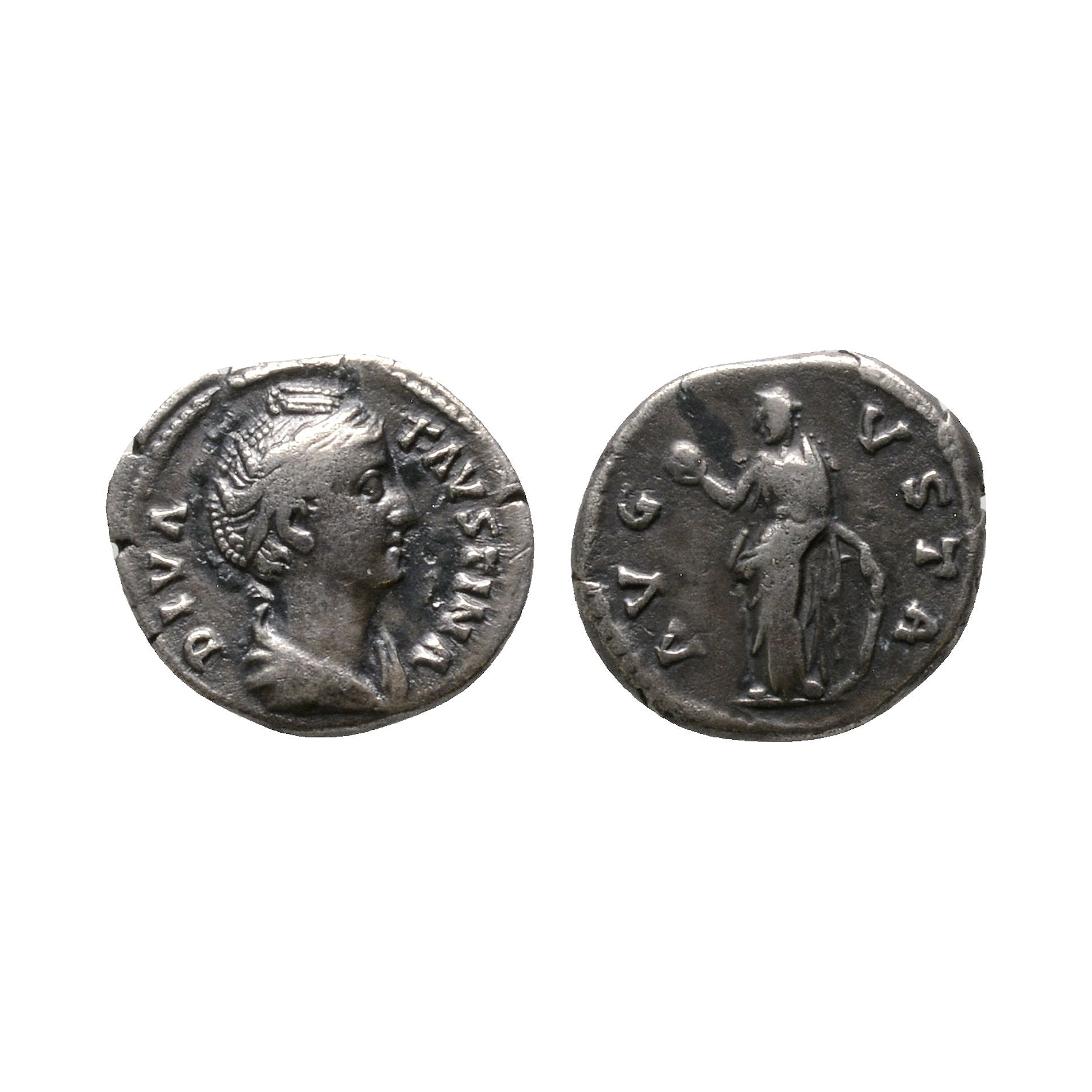 Wife of Antoninus Pius. Rome mint, posthumous after 141 AD. Obv: DIVA FAVSTINA, draped and veiled bust right. Rev: AVGVSTA, Venus standing facing, head left, holding apple, resting left hand on shield. 3.17 grams.