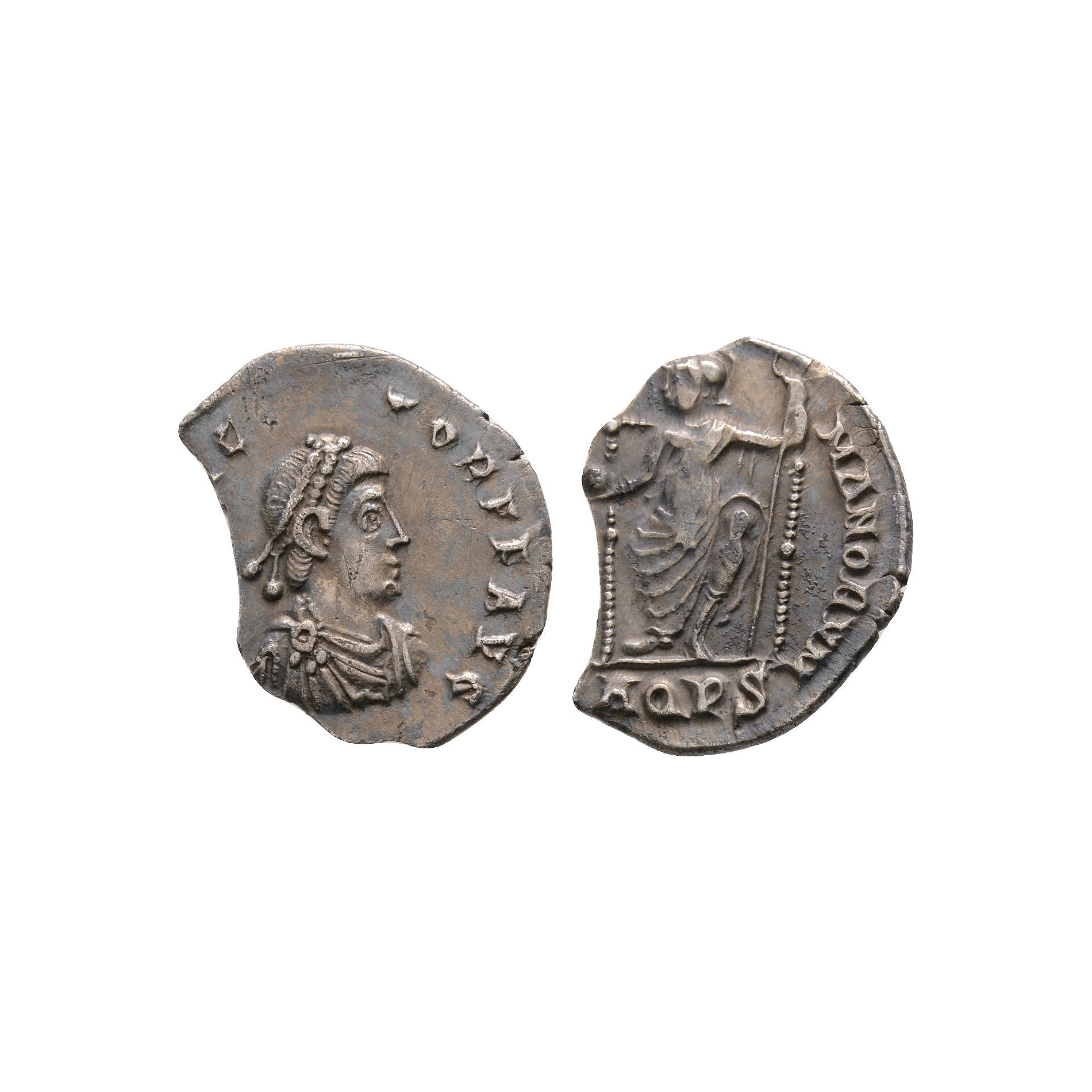 Aquileia mint. Obv: [DN FL VI]CTOR P F AVG legend with diademed, draped and cuirassed bust right. Rev: [VIRTVS RO]MANORVM legend with Roma seated facing holding orb and long sceptre; mintmark AQ PS in exergue. 1.03 grams.