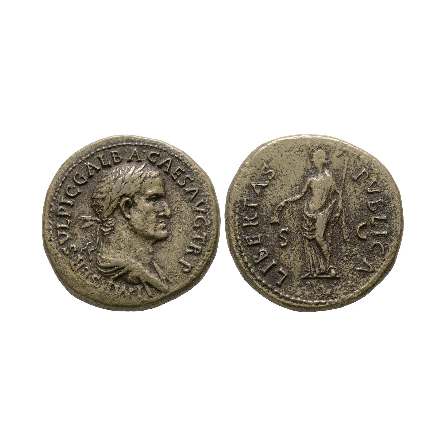 A cast copy imitating: Rome. Late summer 68 A.D. Obv: IMP SER SVLPIC GALBA CAES AVG TR P, laureate draped bust right. Rev: LIBERTAS PVBLICA, S-C, Libertas standing left, holding pileus and sceptre in left. 26.86 grams, 35 mm.