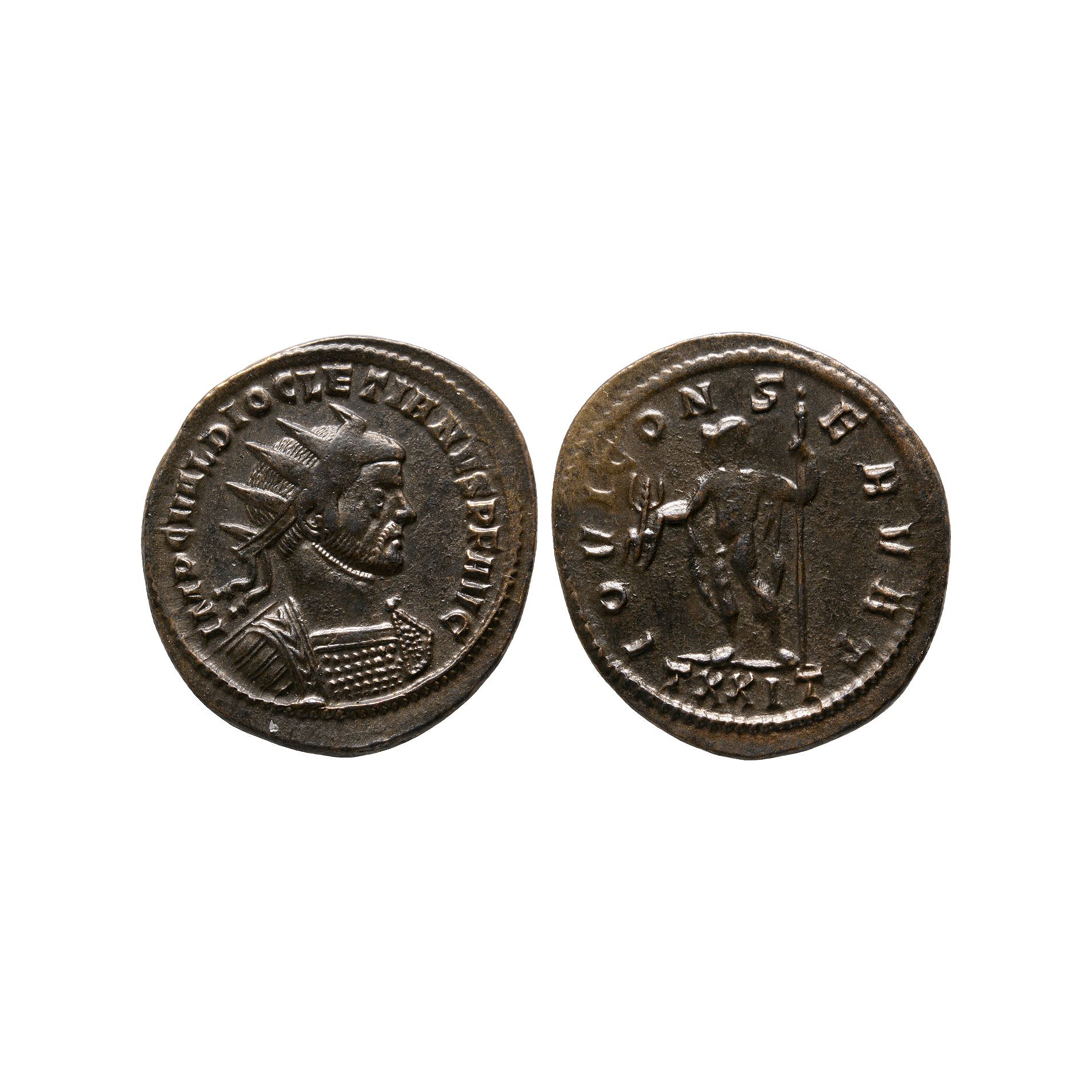 Ticinum mint. Obv: IMP C VAL DIOCLETIANVS AVG, radiate bust right, cuirassed. Rev: IOVI CONSERVAT, Jupiter standing left, holding thunderbolt and sceptre, mintmark in exergue TXXIT. 3.53 grams.