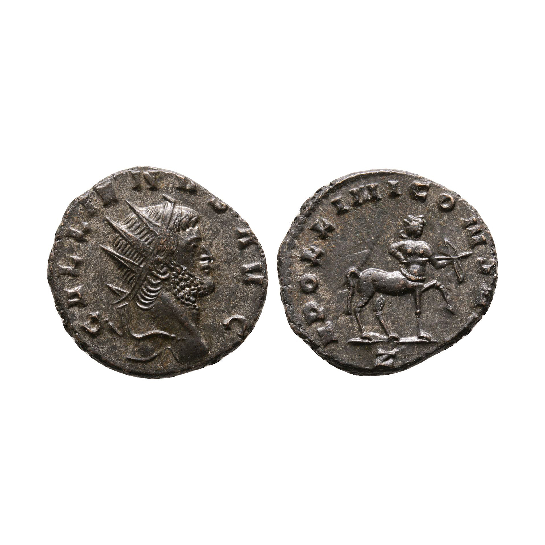 Sole reign. Rome mint. Obv: GALLIENVS AVG, radiate head right. Rev: APOLLINI CONS AVG, centaur walking right, drawing bow, officina letter Z below. 3.42 grams, 20 mm.