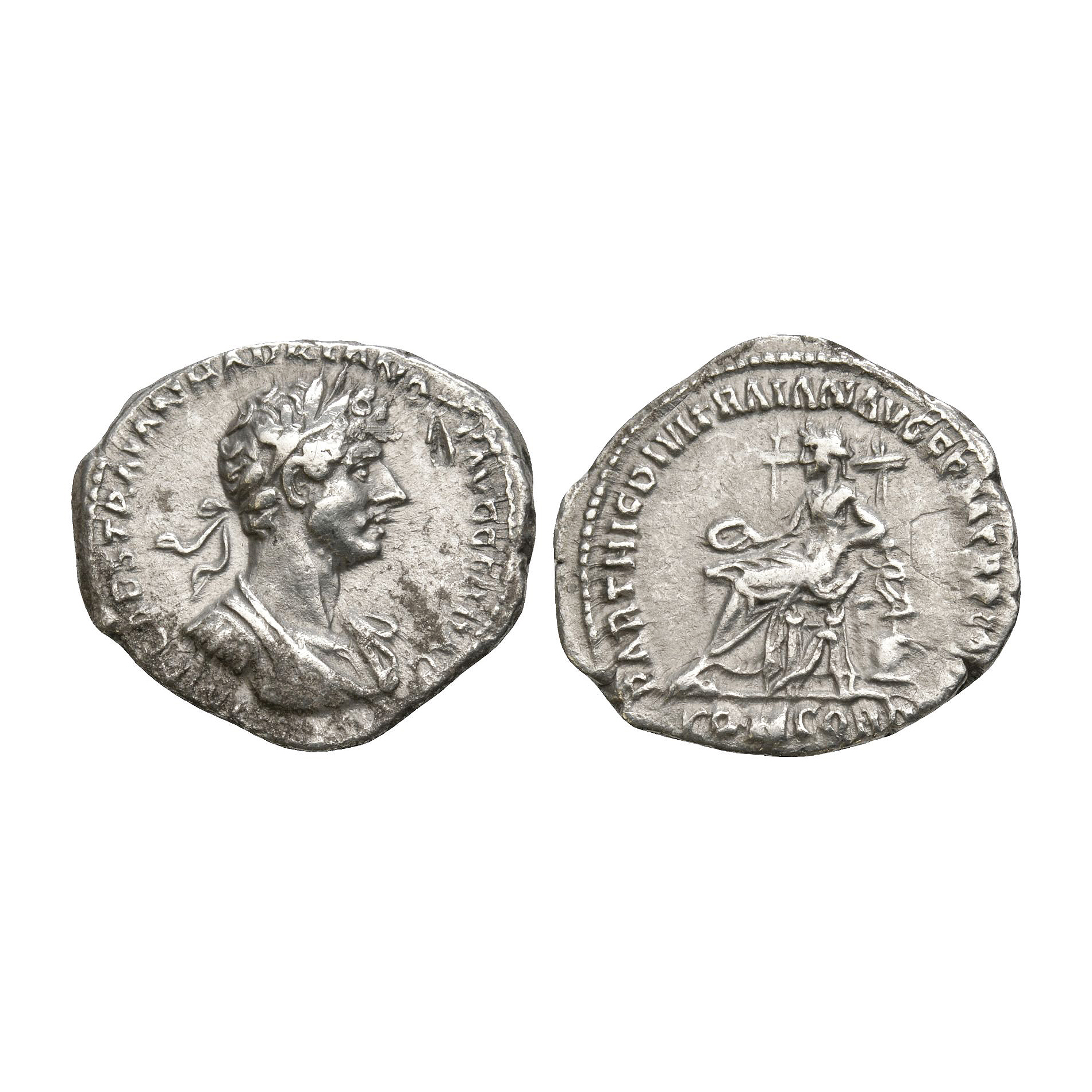 Rome mint. Obv: IMP CAES TRAIAN HADRIAN OPT AVG GER DAC legend with laureate and draped bust right. Rev: PARTHIC DIVI TRAIAN AVG F P M TR P COS P P legend with Concordia seated left holding patera with left arm resting on Spes, cornucopia below. 3.17 grams.