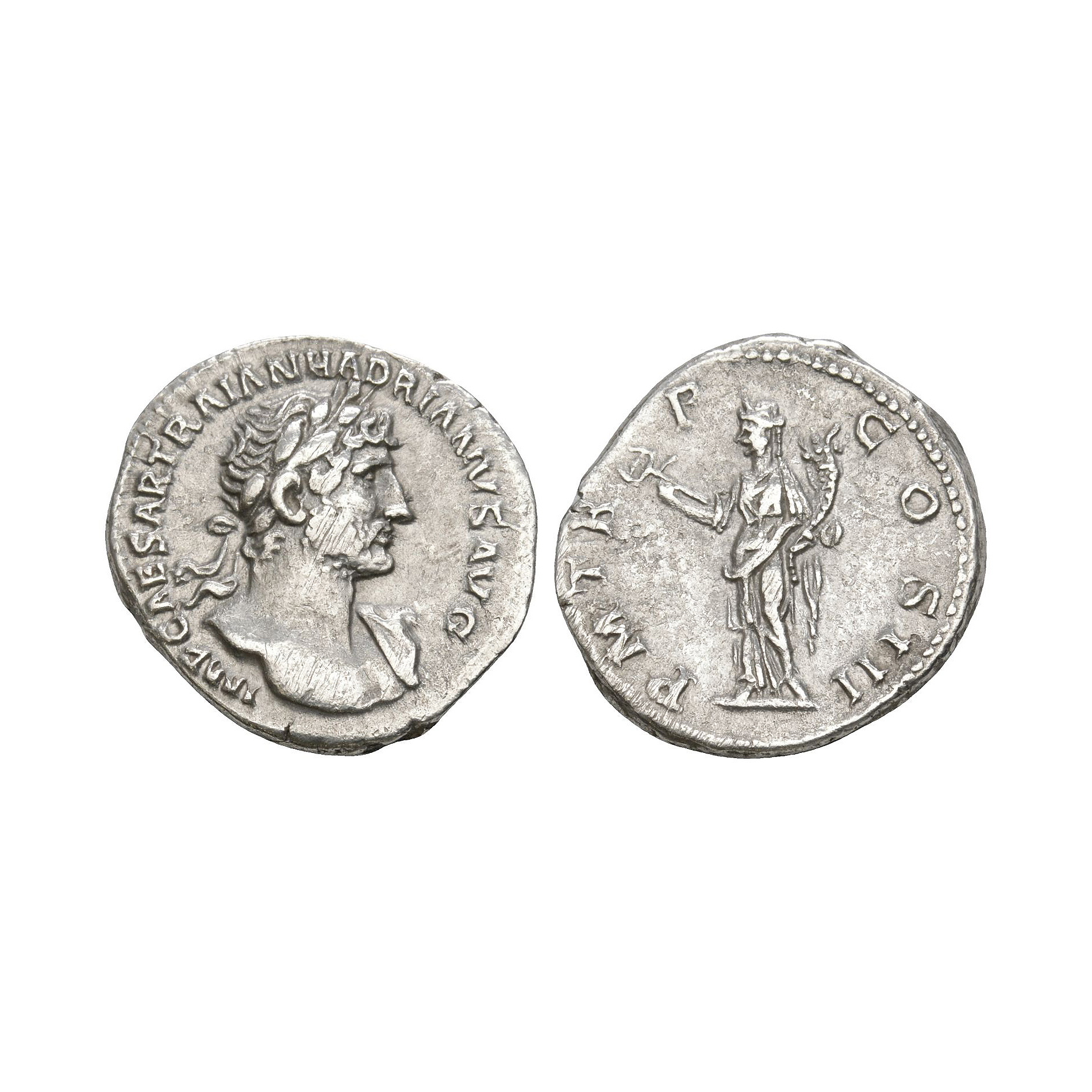 Rome mint. Obv: IMP CAESAR TRAIAN HADRIANVS AVG legend with laureate and draped bust right. Rev: P M TR P COS III legend with Felicitas (or Pax?) standing left holding caduceus and cornucopia. 3.22 grams.