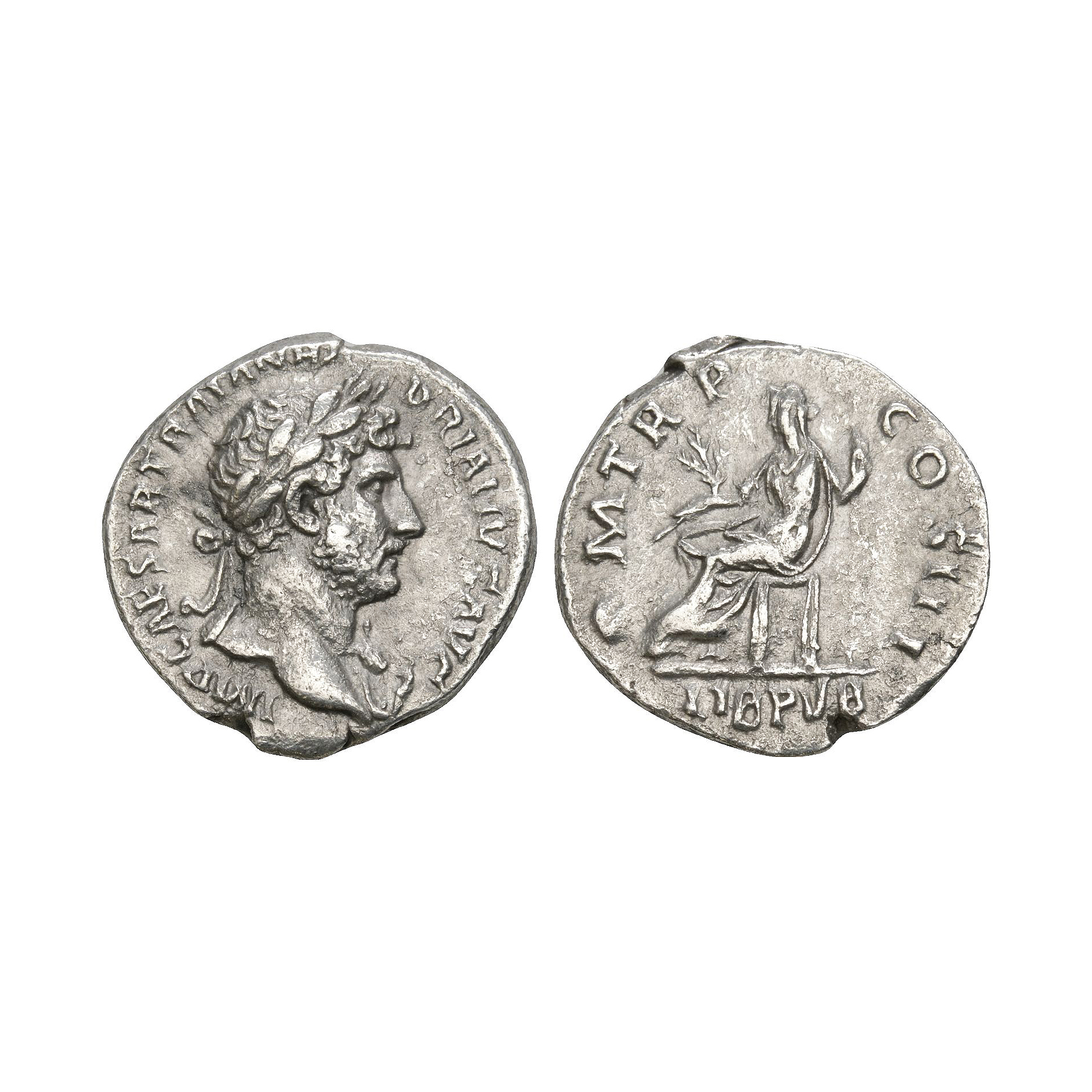 Rome mint. Obv: IMP CAESAR TRAIAN HADRIANVS AVG legend with laureate bust right. Rev: P M TR P COS III legend with Libertas seated left holding branch and sceptre; LIB PVB in exergue. 3.04 grams.