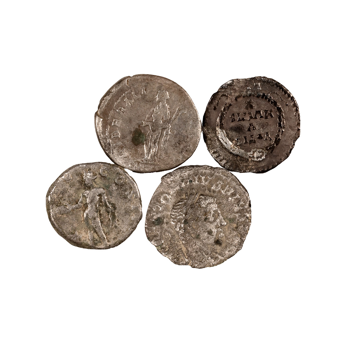 Group comprising: denarii of Hadrian, Septimius Severus and Caracalla(?); siliqua of Julian II (wreath, Lugdunum). 10.13 grams.