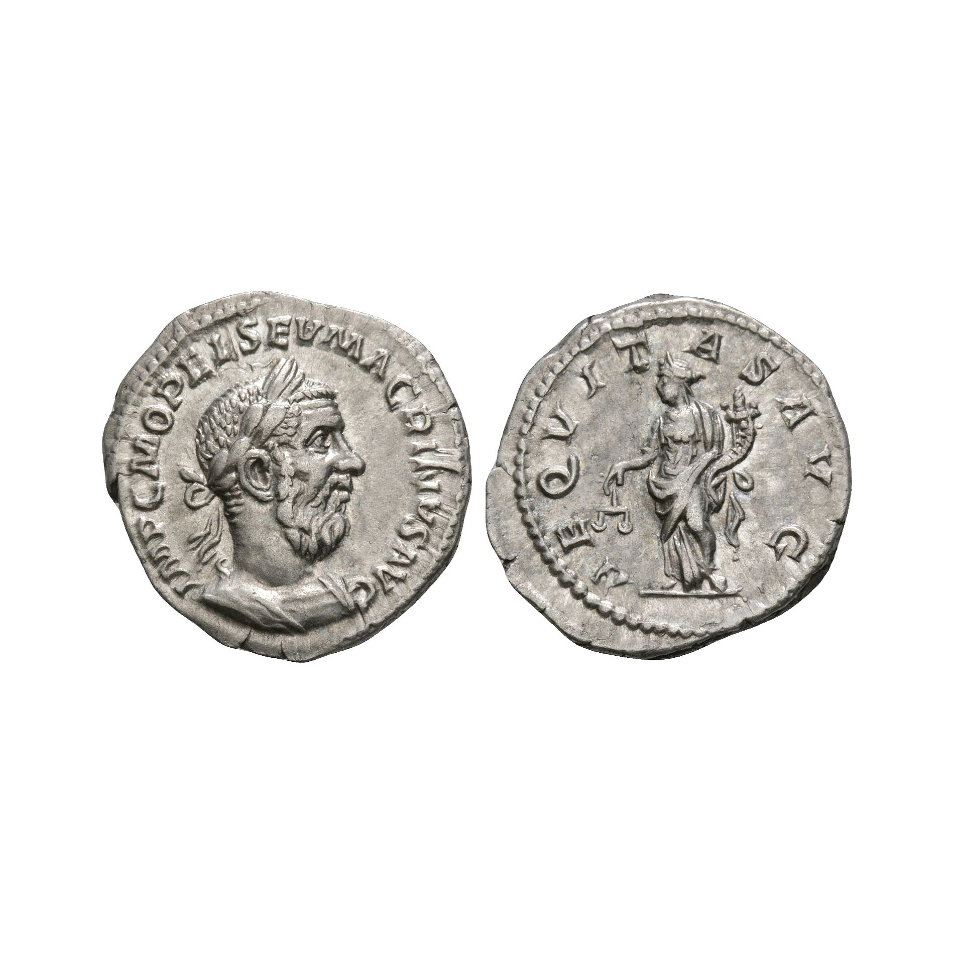 Rome mint. Obv: IMP C M OPEL SEV MACRINVS AVG legend with laureate and draped bust right. Rev: AEQVITAS AVG legend with Aequitas standing left holding scales and cornucopia. 3.08 grams.