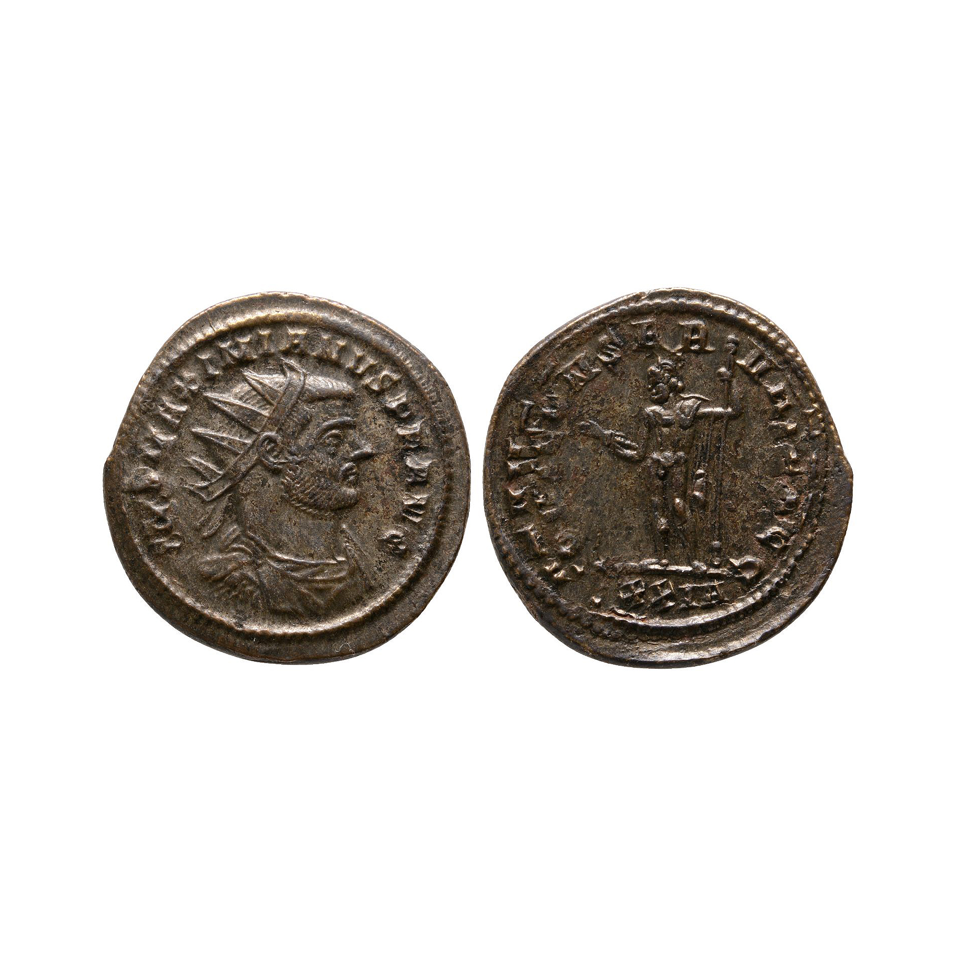 Rome. Obv: IMP MAXIMIANVS PF AVG, radiate, draped and cuirassed bust right. Rev: IOVI CONSERVAT AVGG, Jupiter standing left holding thunderbolt and sceptre, mintmark XXIA, nothing at foot. 4.17 grams.